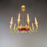 Neoklassizistischer Kronleuchter aus rotem Glas und Messing