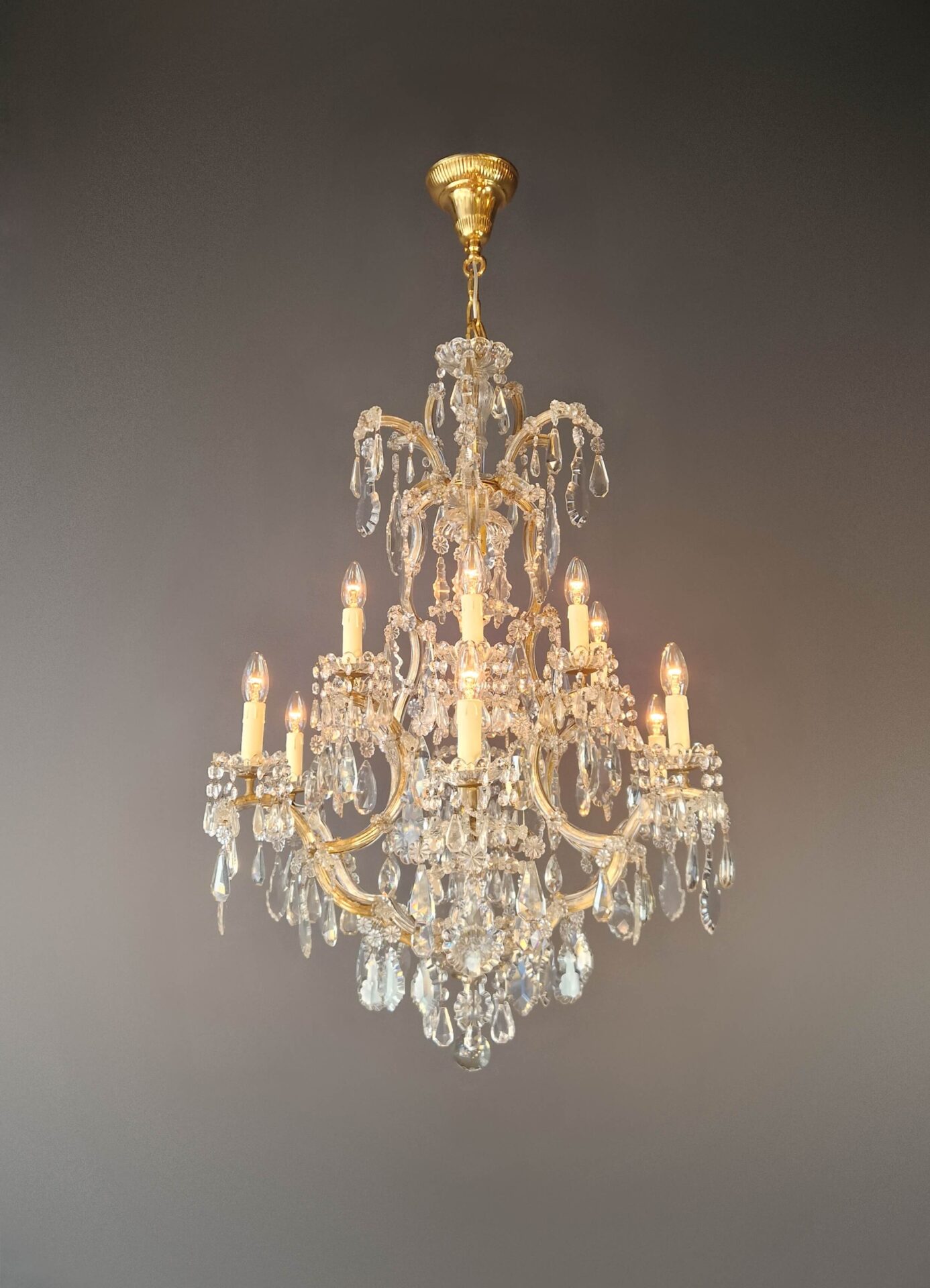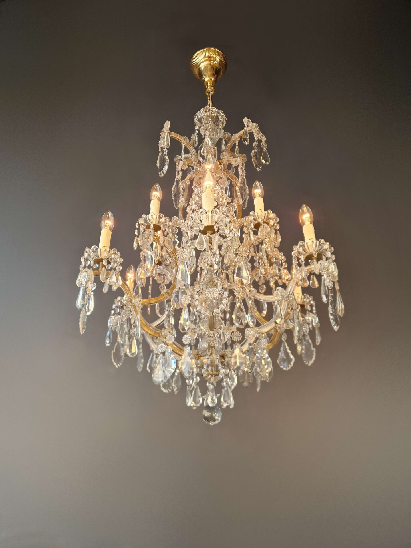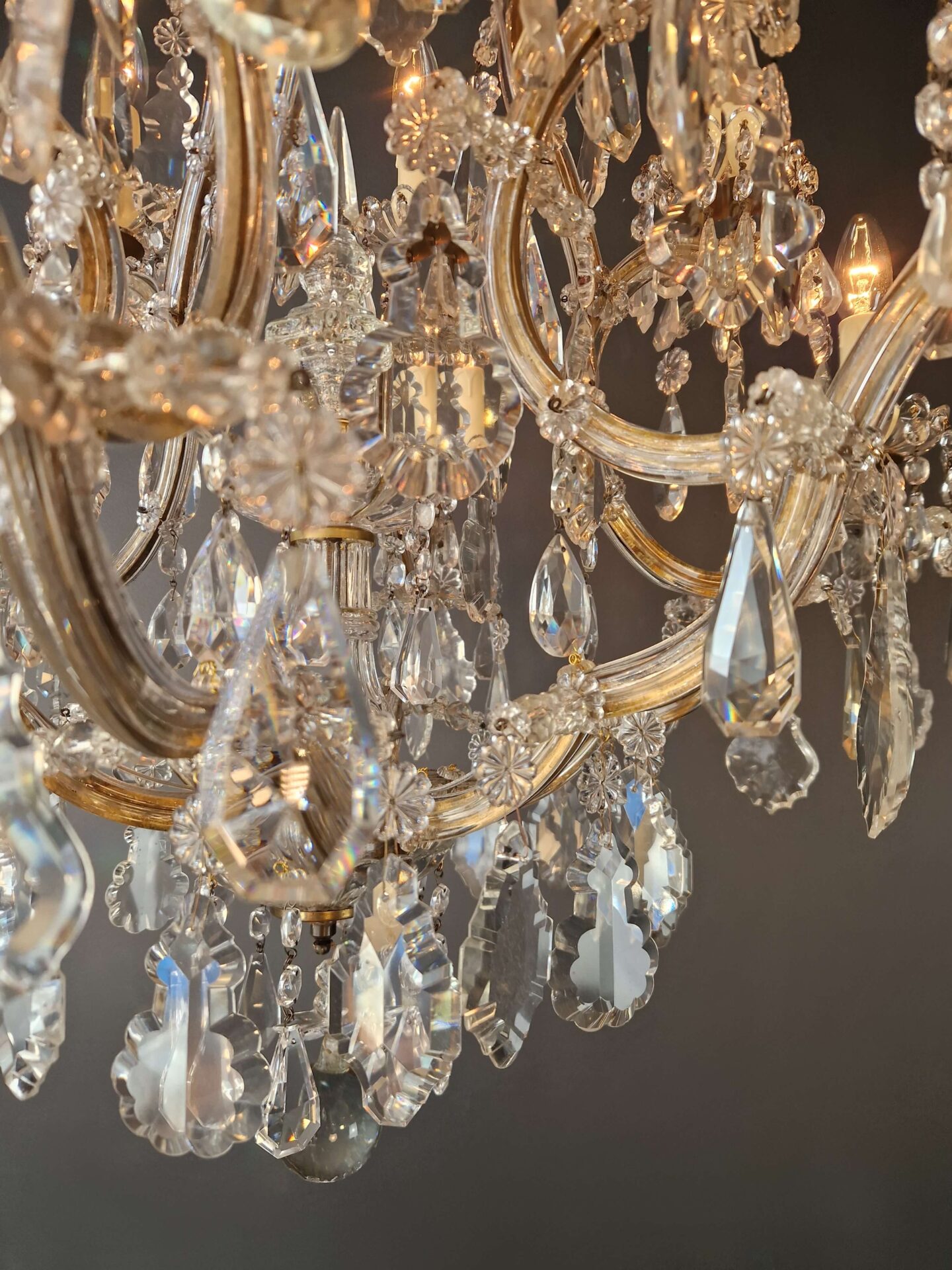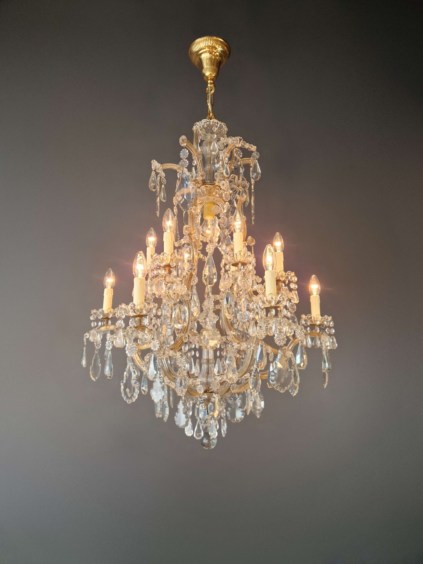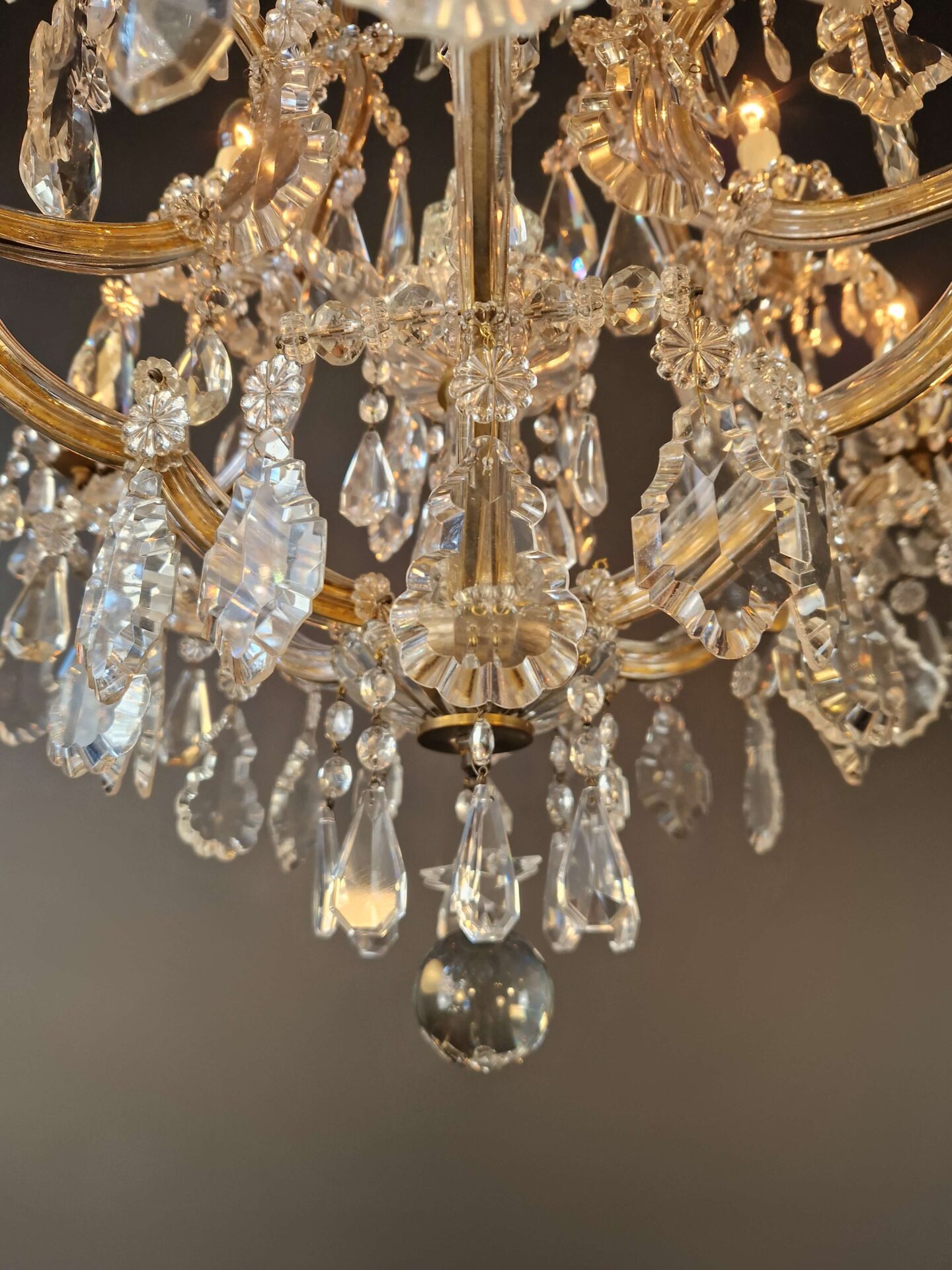 Charakteristisch für den Maria-Theresia-Stil sind die anmutig geschwungenen Arme, die dichten Kristallstränge und die Vielfalt der geschliffenen Elemente, die das Licht in alle Richtungen reflektieren. Die Kombination aus einem strukturierten Gestell und dekorativem Reichtum verleiht dem Kronleuchter seine zeitlose Anziehungskraft.