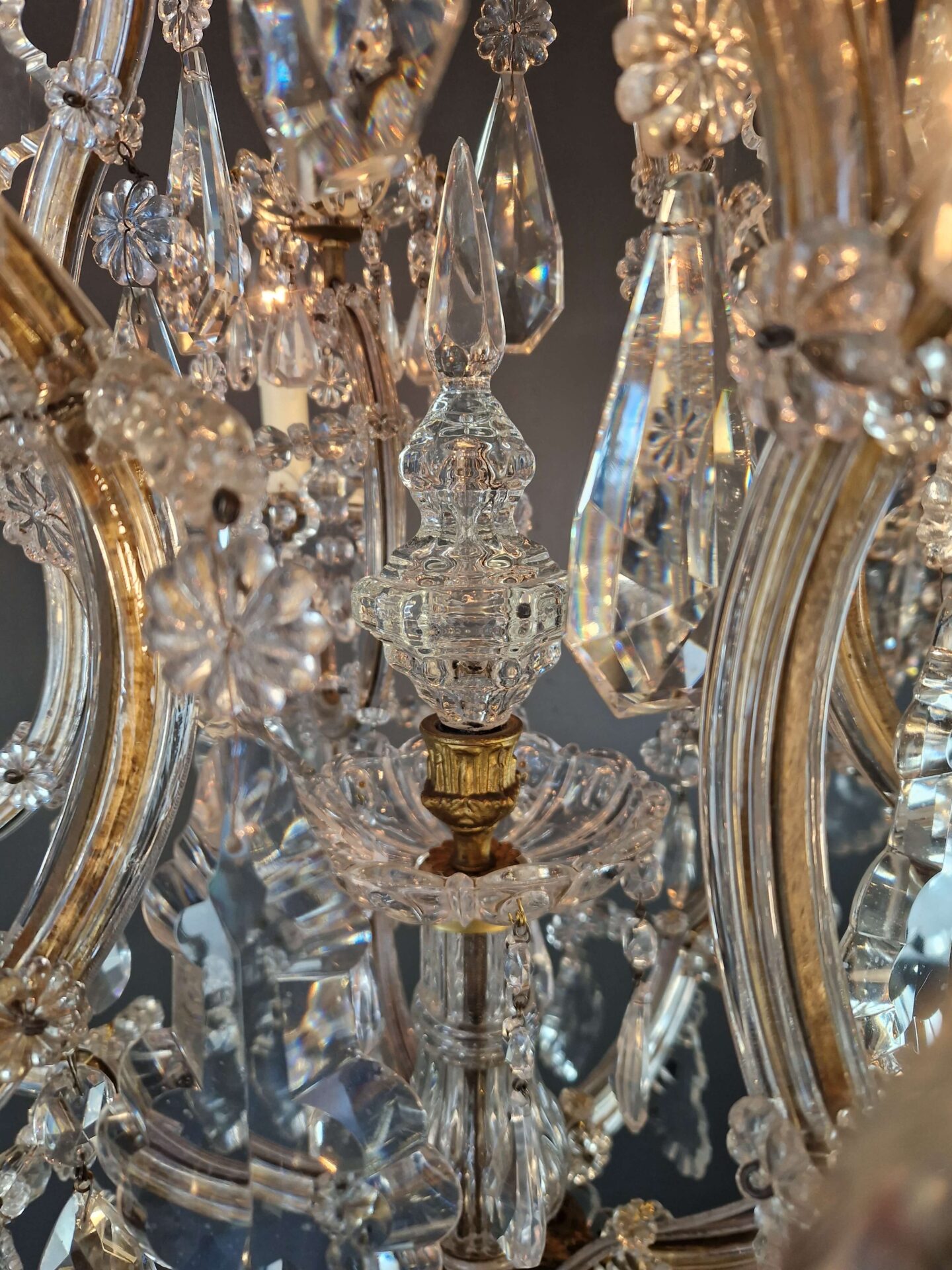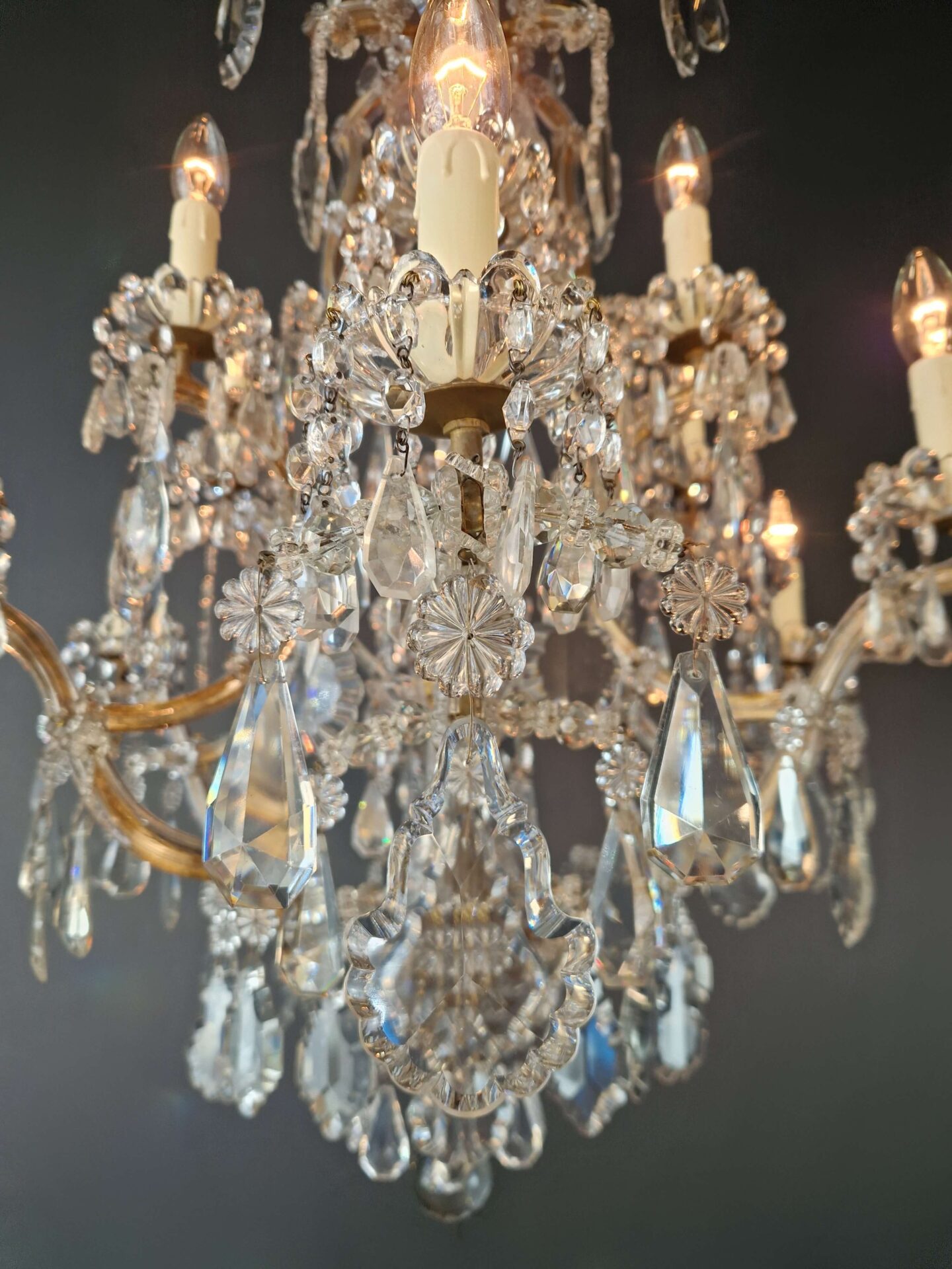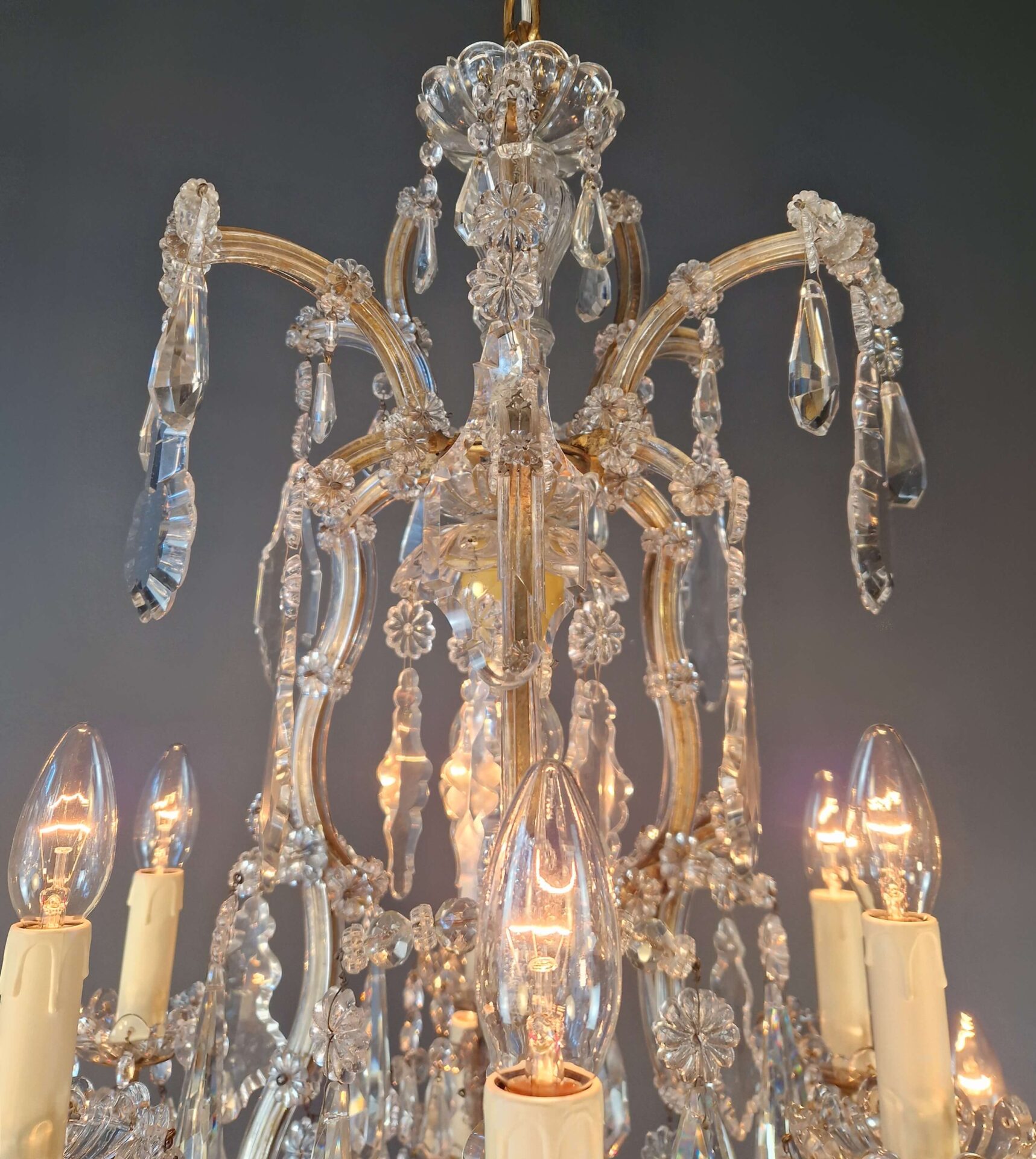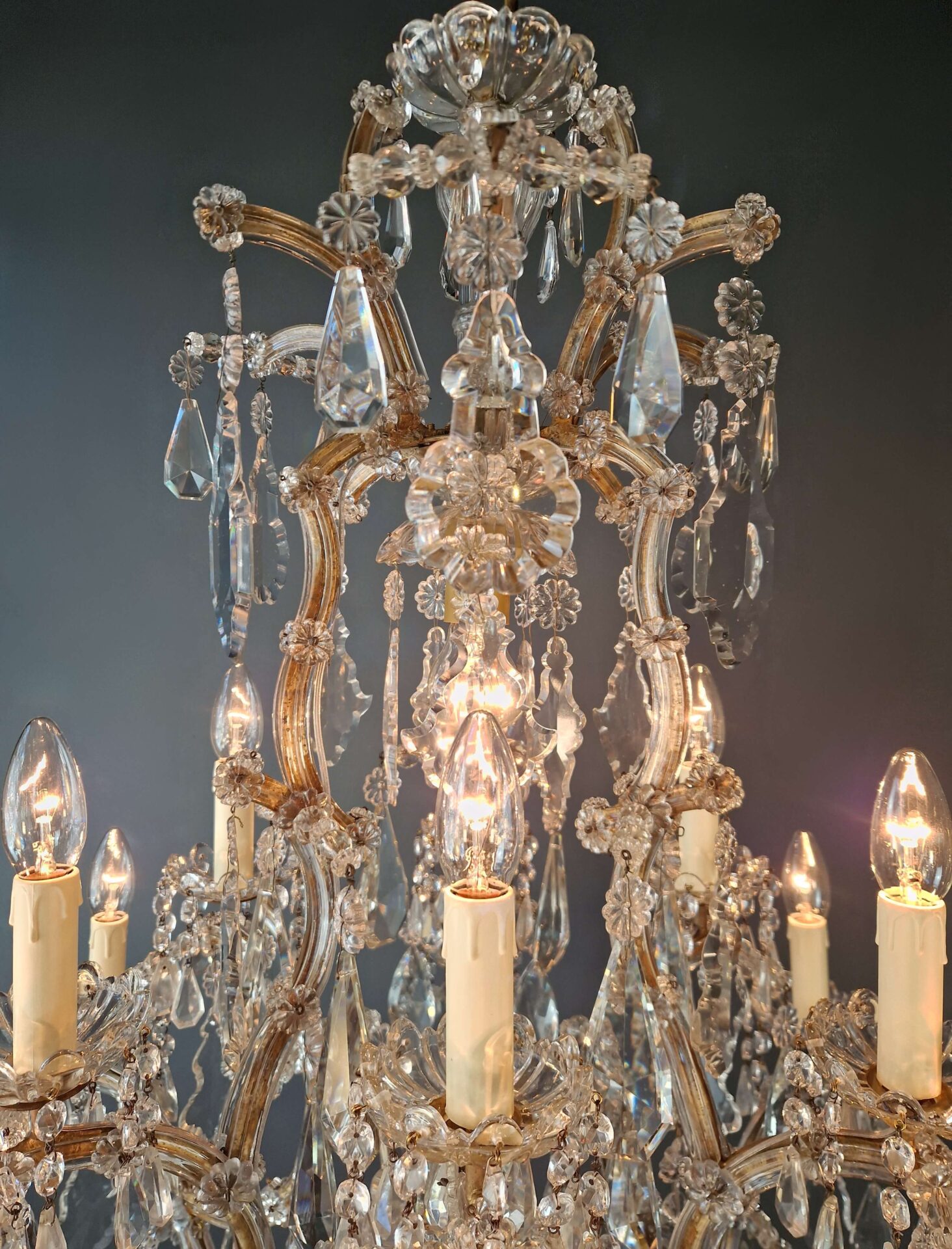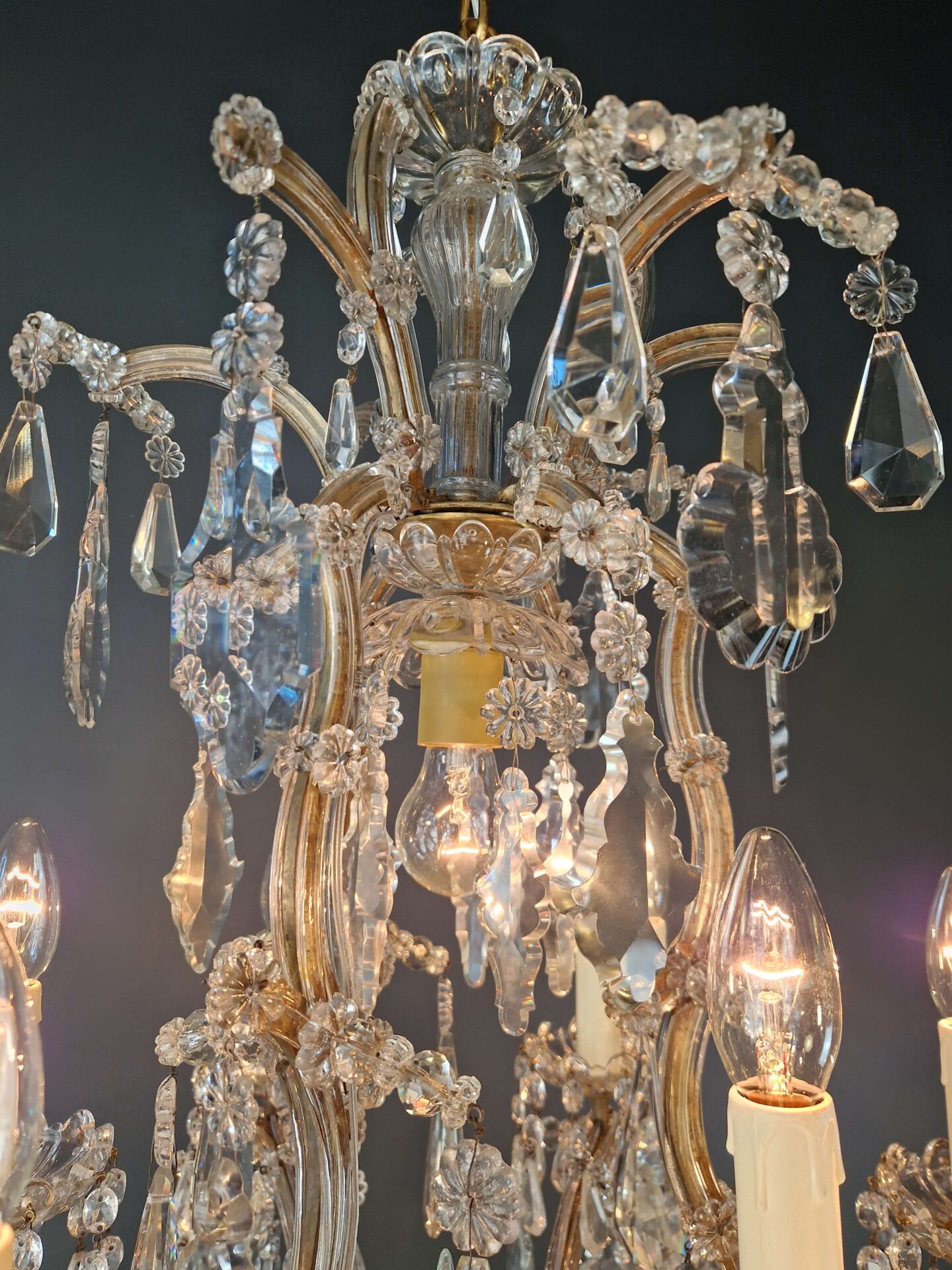 Charakteristisch für den Maria-Theresia-Stil sind die anmutig geschwungenen Arme, die dichten Kristallstränge und die Vielfalt der geschliffenen Elemente, die das Licht in alle Richtungen reflektieren. Die Kombination aus einem strukturierten Gestell und dekorativem Reichtum verleiht dem Kronleuchter seine zeitlose Anziehungskraft.