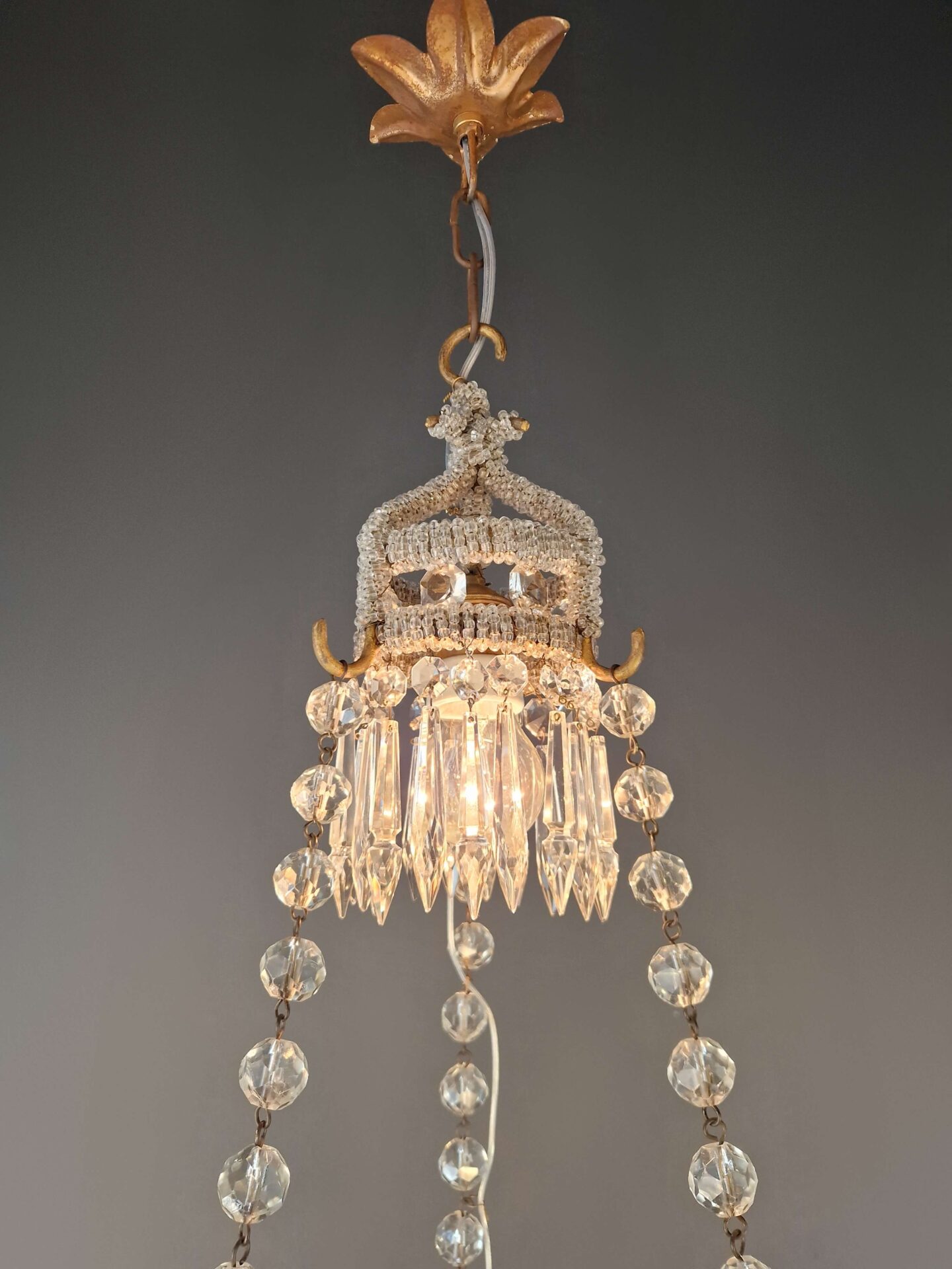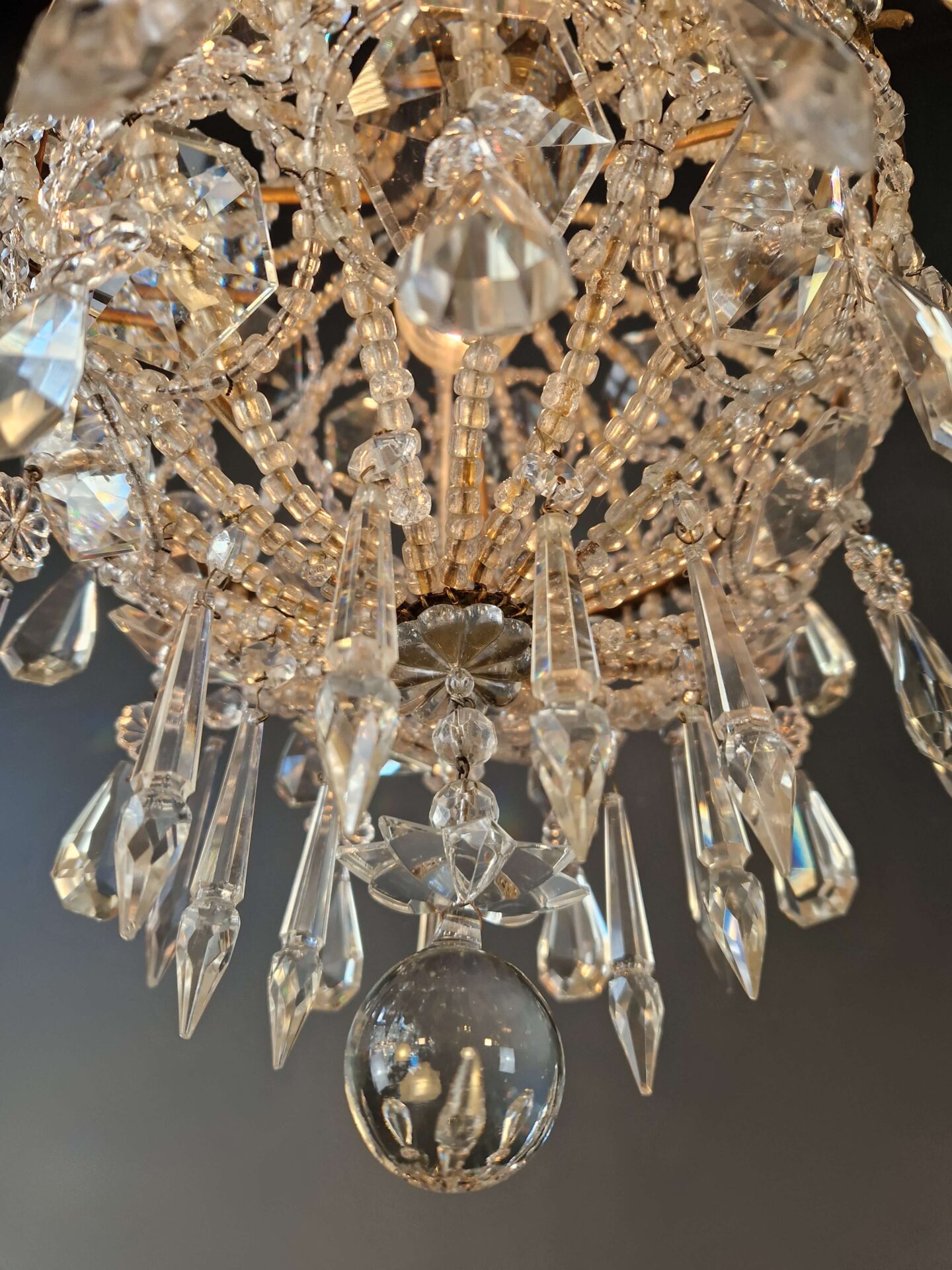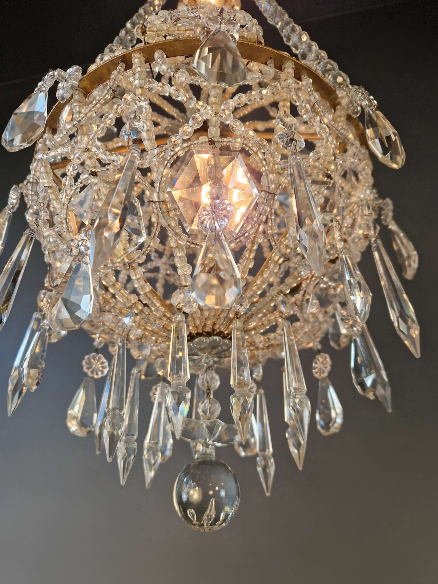 Komplett restauriert in unserer Berliner Werkstatt. Die Verkabelung wurde erneuert und alle Kristalle sorgfältig von Hand gebunden, wodurch ein klares und lebendiges Lichtspiel entsteht.