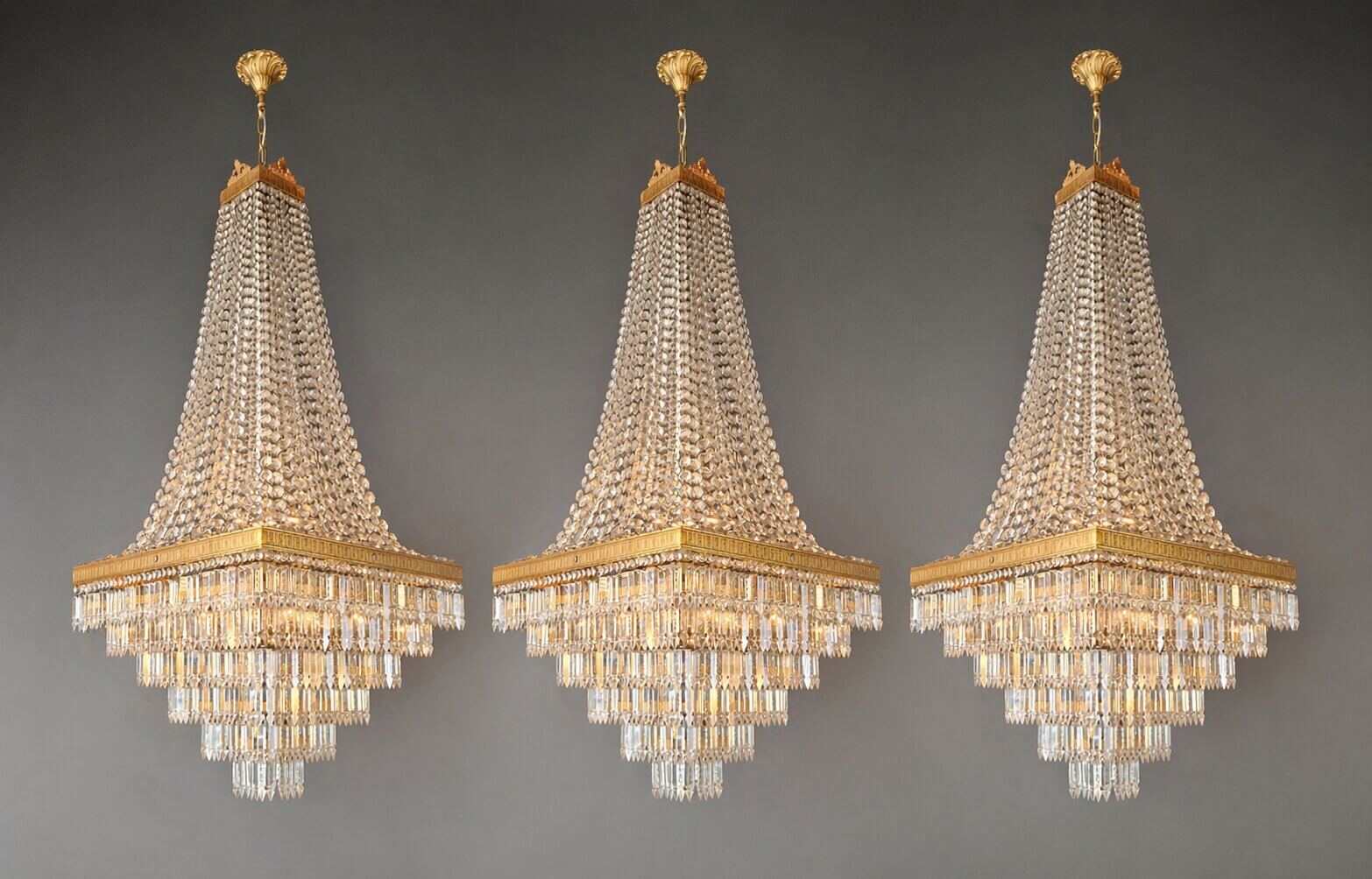 Der Kronleuchter ist sowohl einzeln als auch als Paar oder als exklusives 3er Set erhältlich. Besonders als Gruppe entfaltet er eine eindrucksvolle Wirkung und eignet sich ideal für größere Räume, Treppenhäuser oder repräsentative Bereiche.