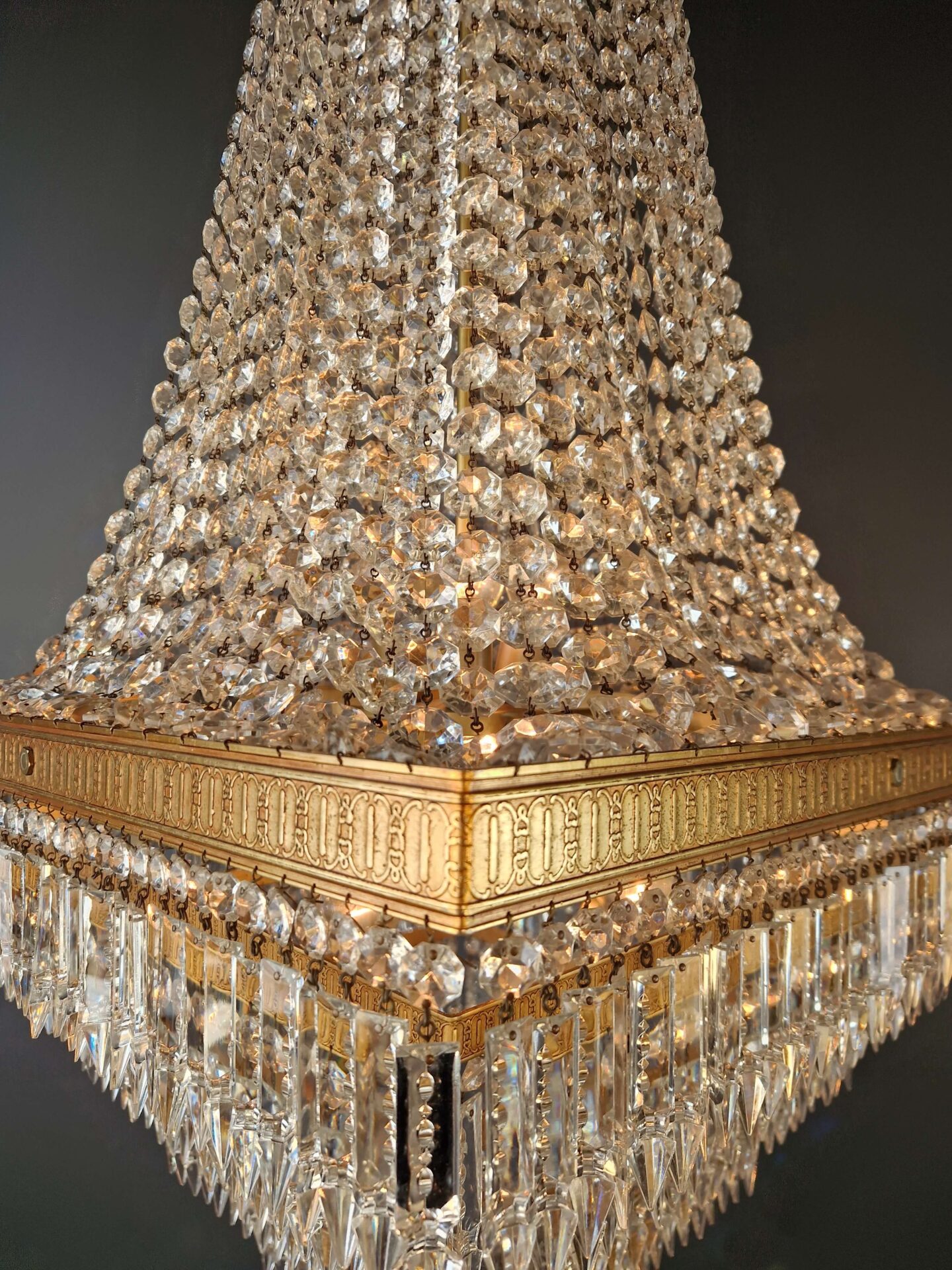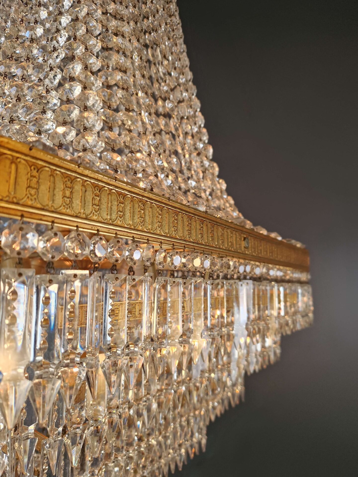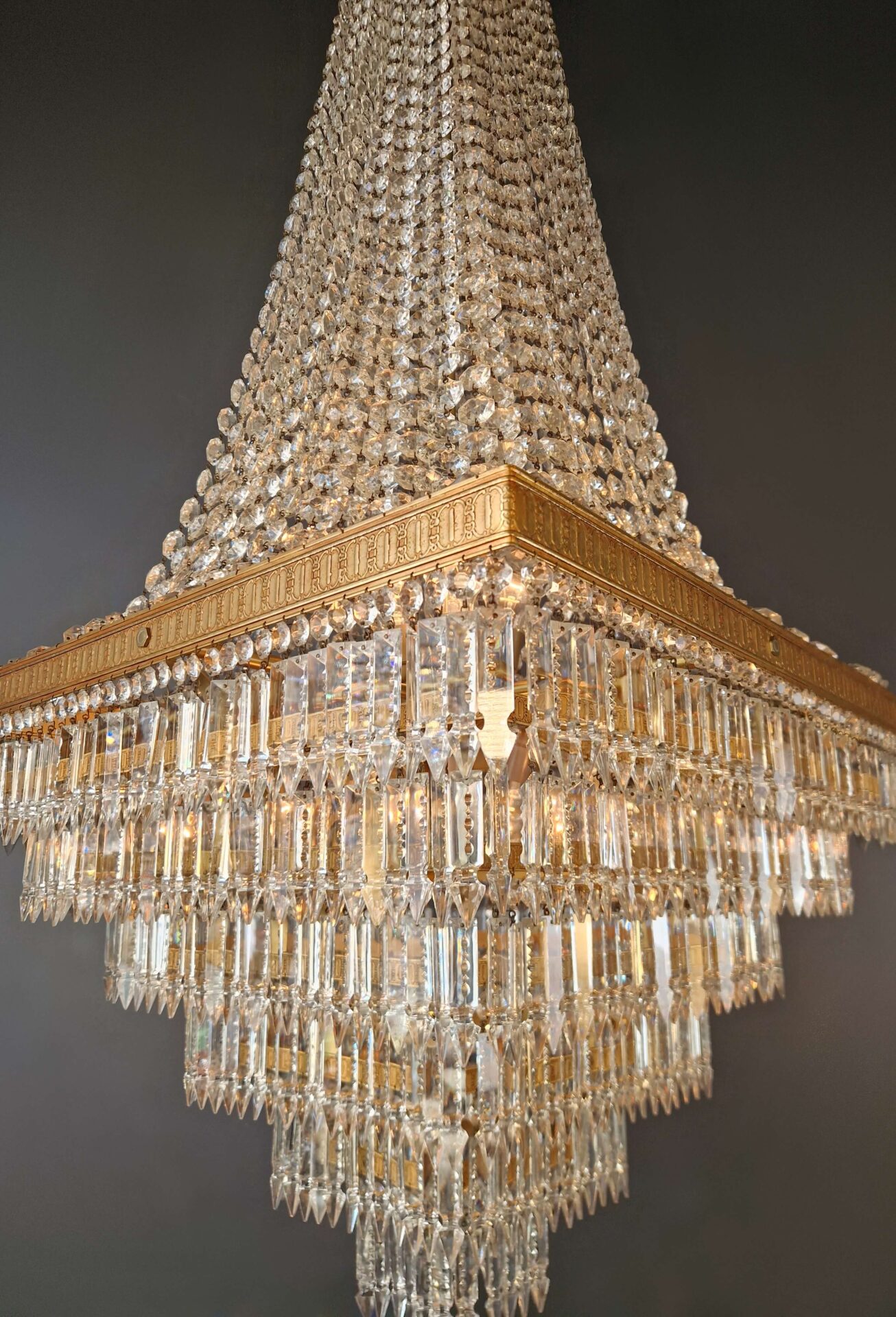 Der Leuchter wurde in unserer Berliner Werkstatt vollständig restauriert. Die Elektrik wurde erneuert und entspricht heutigen Standards. Sämtliche Kristalle wurden von Hand neu geknüpft und sorgen für ein brillantes, lebendiges Funkeln.