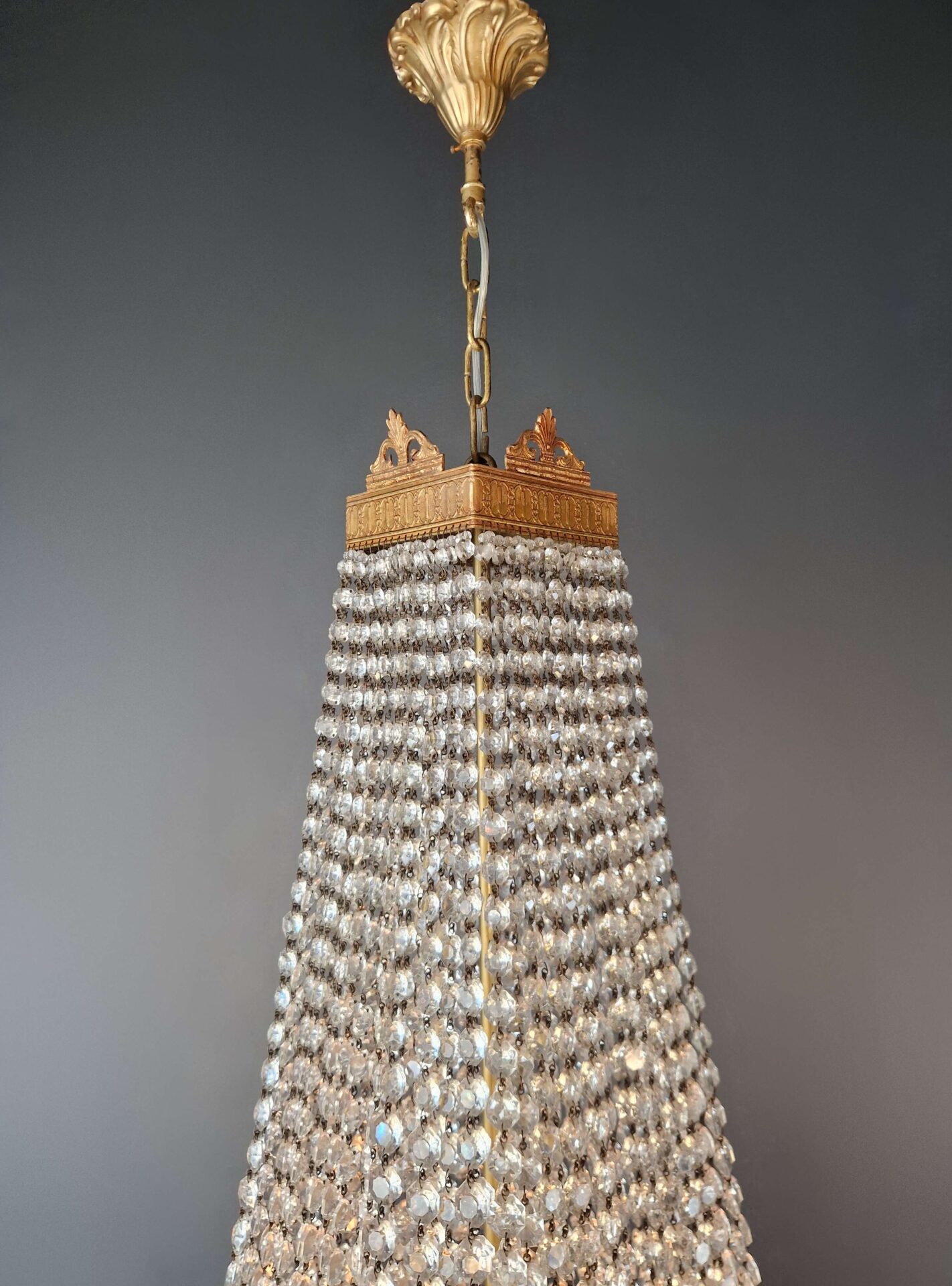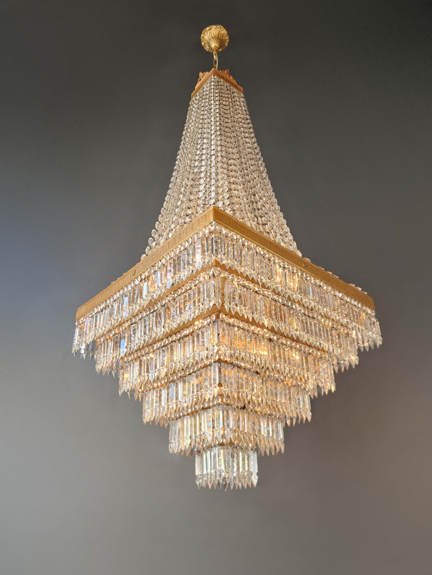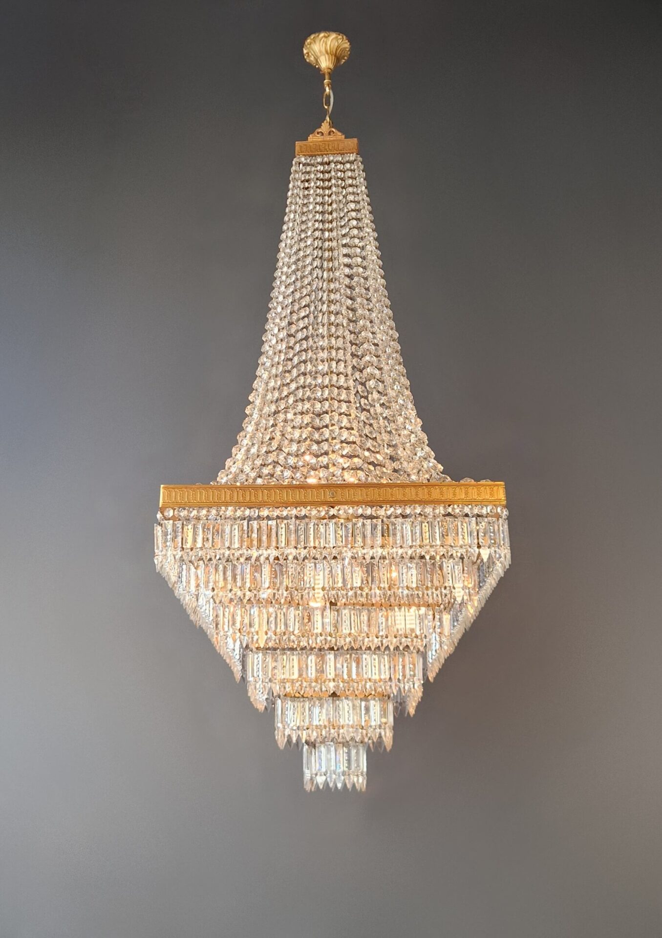Der Leuchter wurde in unserer Berliner Werkstatt vollständig restauriert. Die Elektrik wurde erneuert und entspricht heutigen Standards. Sämtliche Kristalle wurden von Hand neu geknüpft und sorgen für ein brillantes, lebendiges Funkeln.