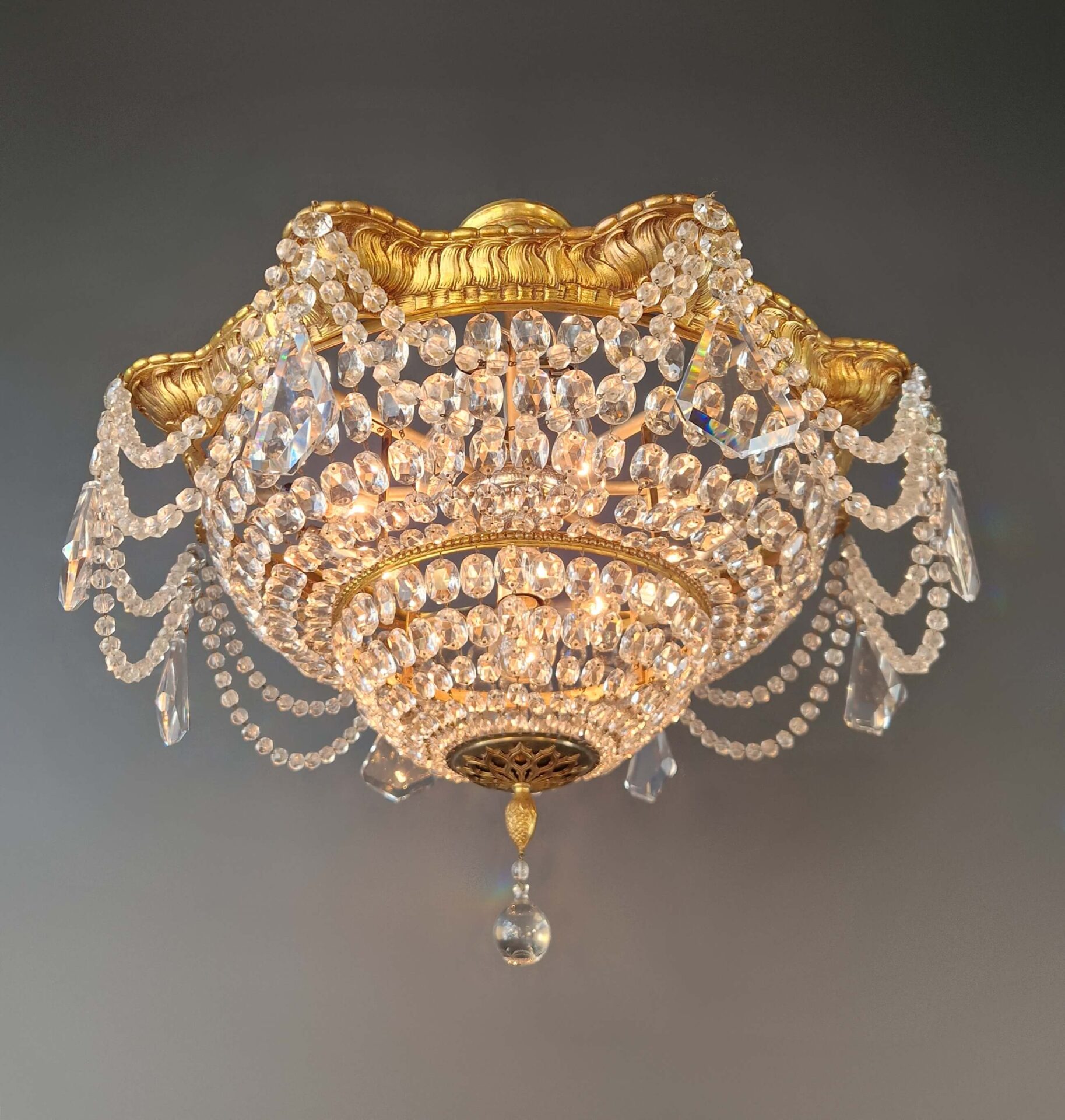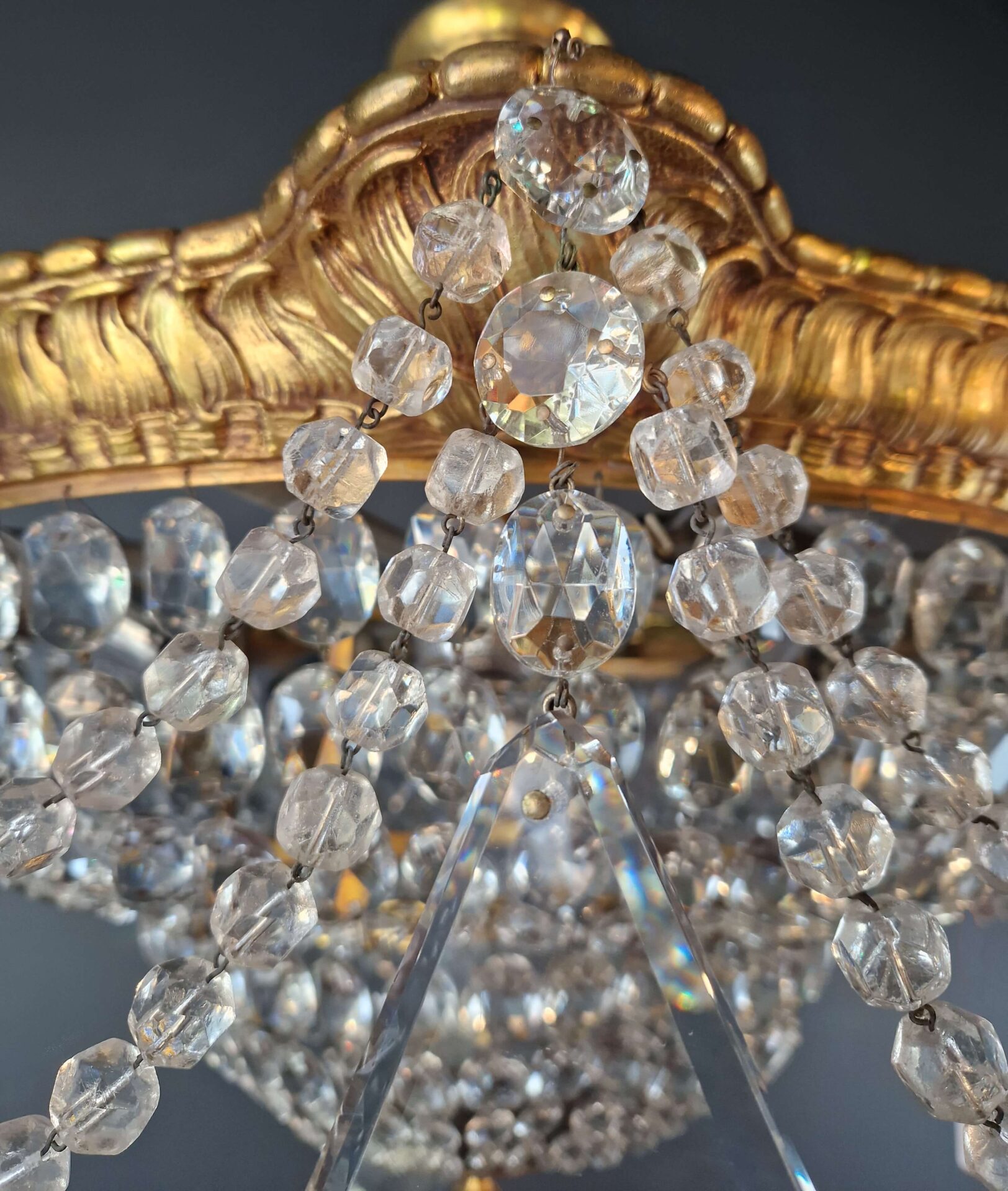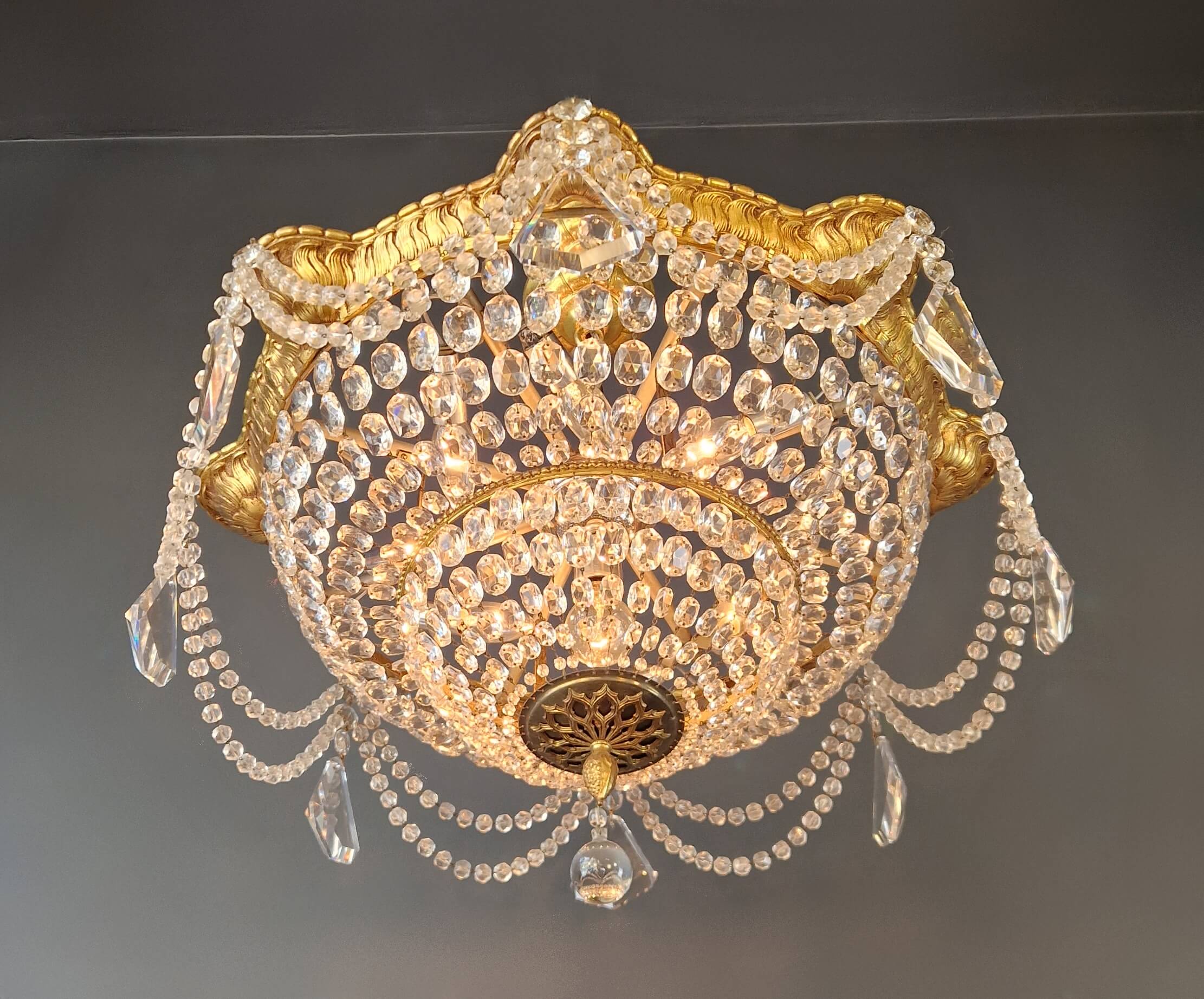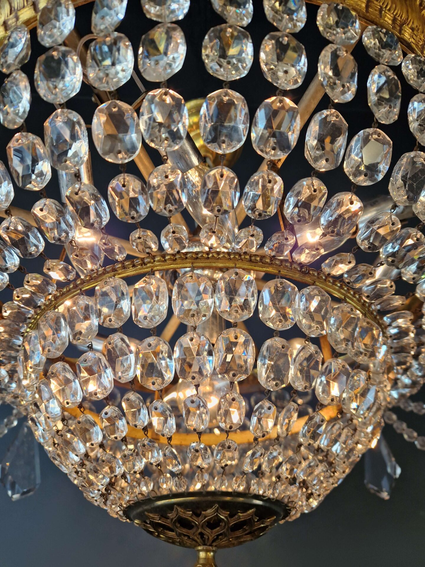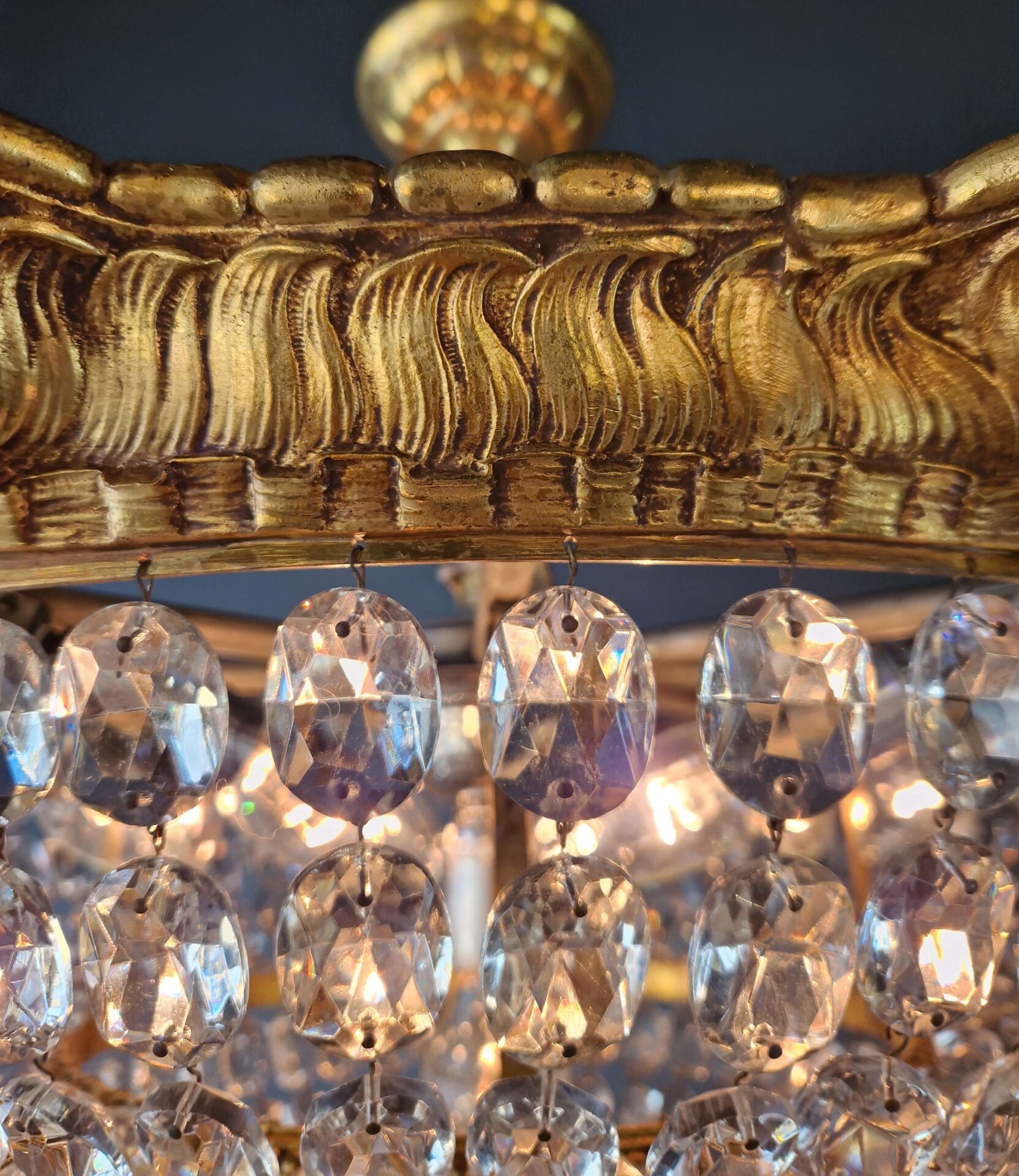 Stilistisch lässt sich dieser Lüster dem Neobarock oder dem Historismus zuordnen. Ein prägendes Merkmal ist der sanft geschwungene obere Rand, der dem Stück Dynamik und fließende Eleganz verleiht. Darunter reflektiert und streut ein dichter, mehrstufiger Kristallkorb das Licht auf wunderschöne Weise im Raum.