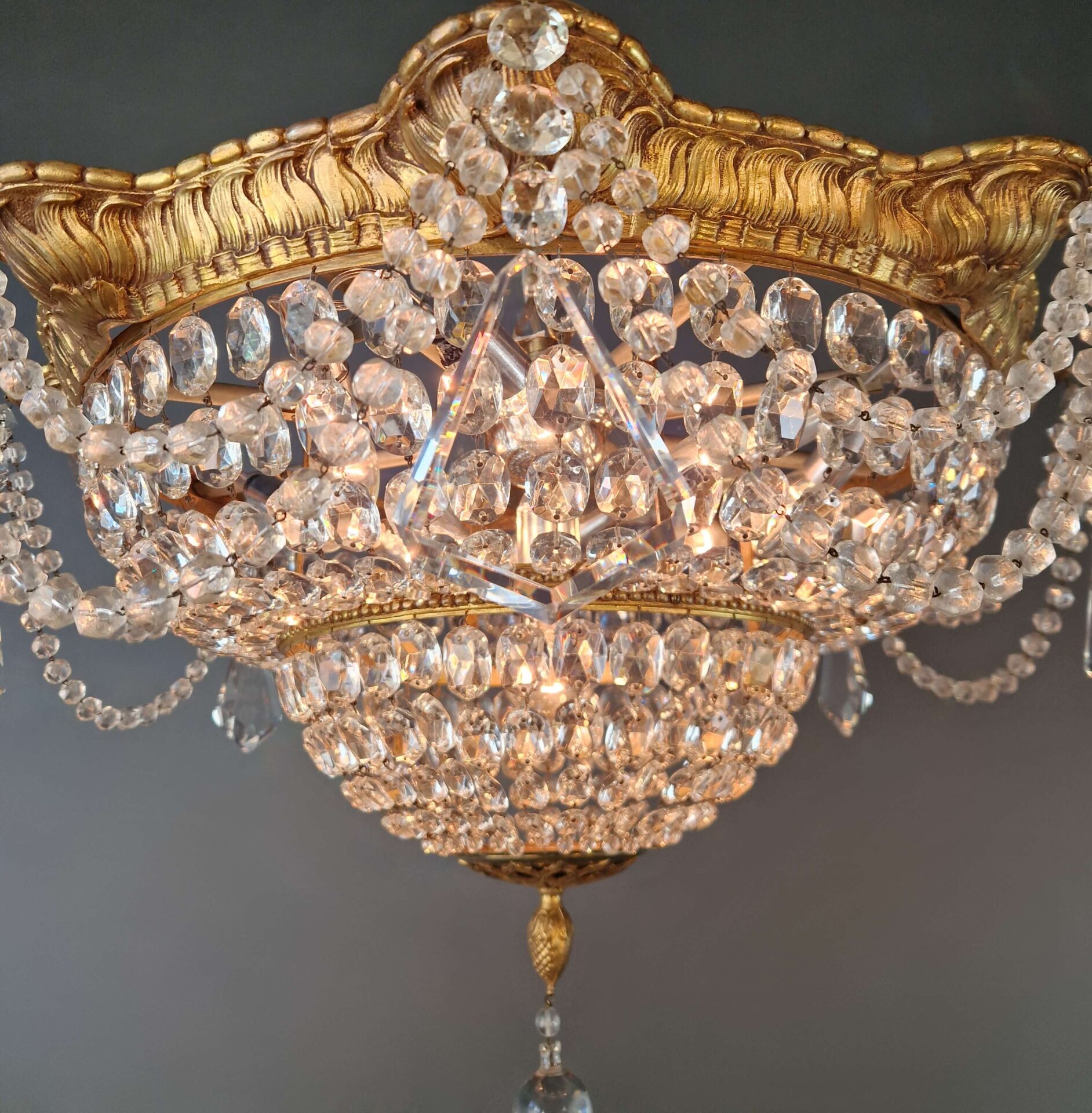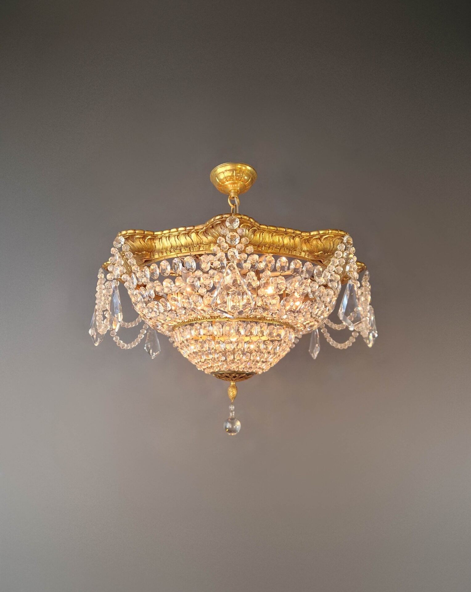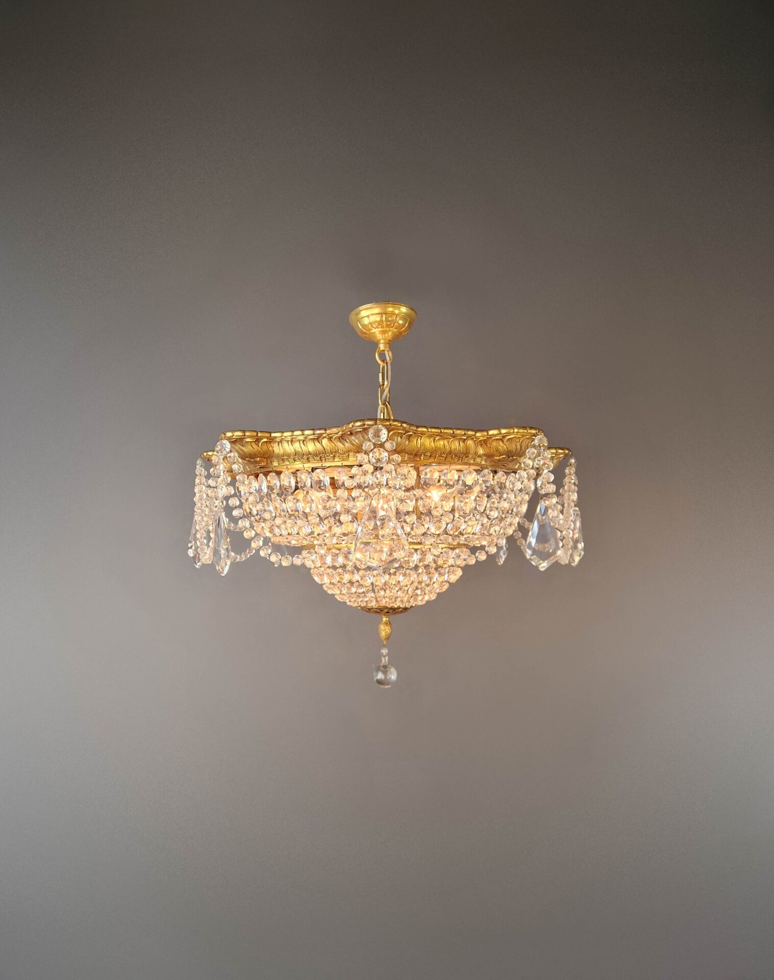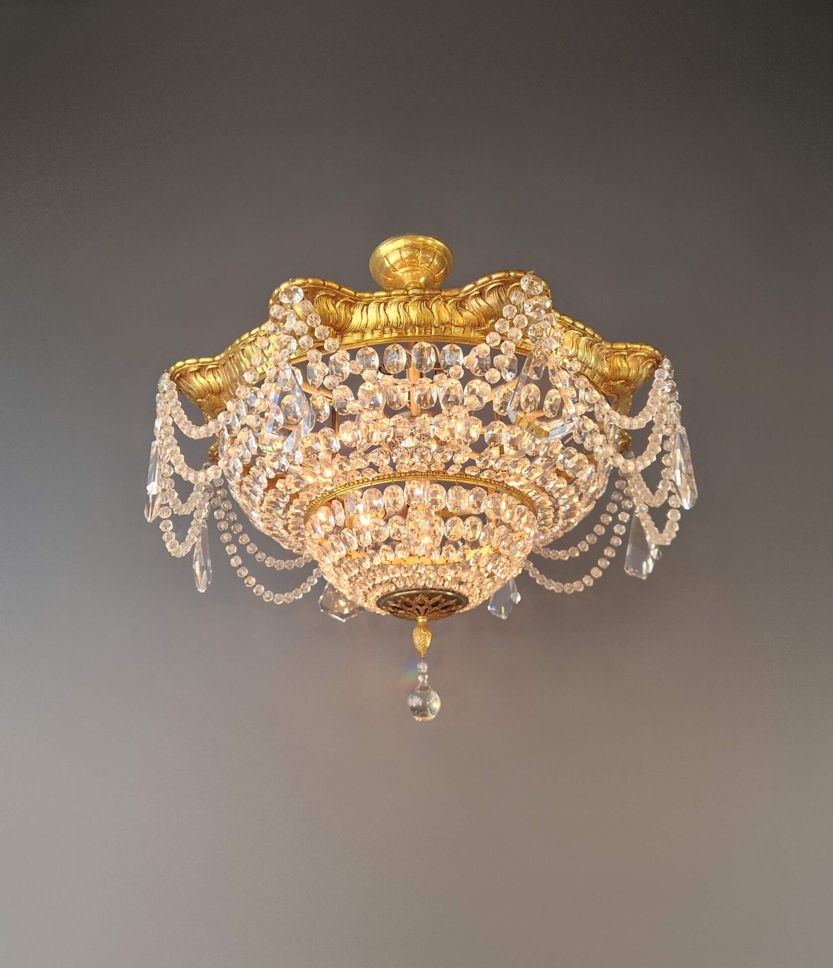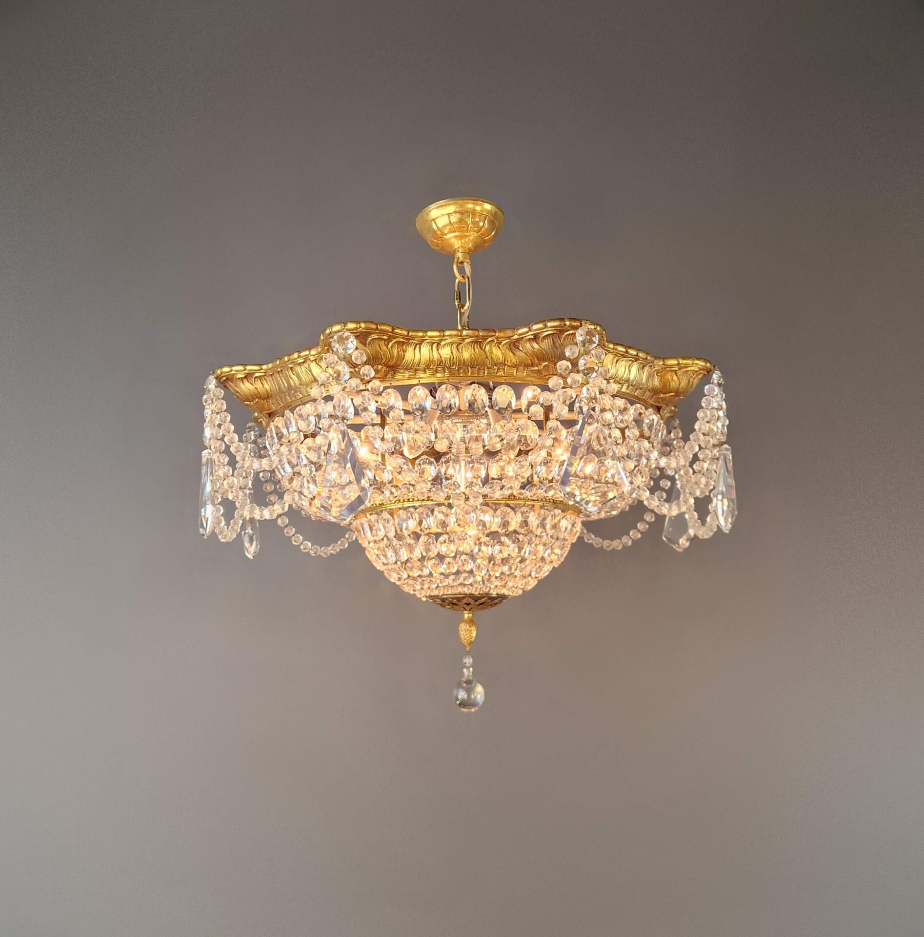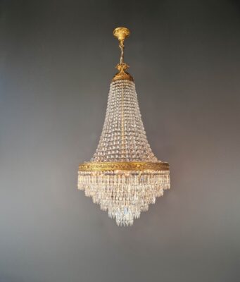 Stilistisch lässt sich dieser Lüster dem Neobarock oder dem Historismus zuordnen. Ein prägendes Merkmal ist der sanft geschwungene obere Rand, der dem Stück Dynamik und fließende Eleganz verleiht. Darunter reflektiert und streut ein dichter, mehrstufiger Kristallkorb das Licht auf wunderschöne Weise im Raum.