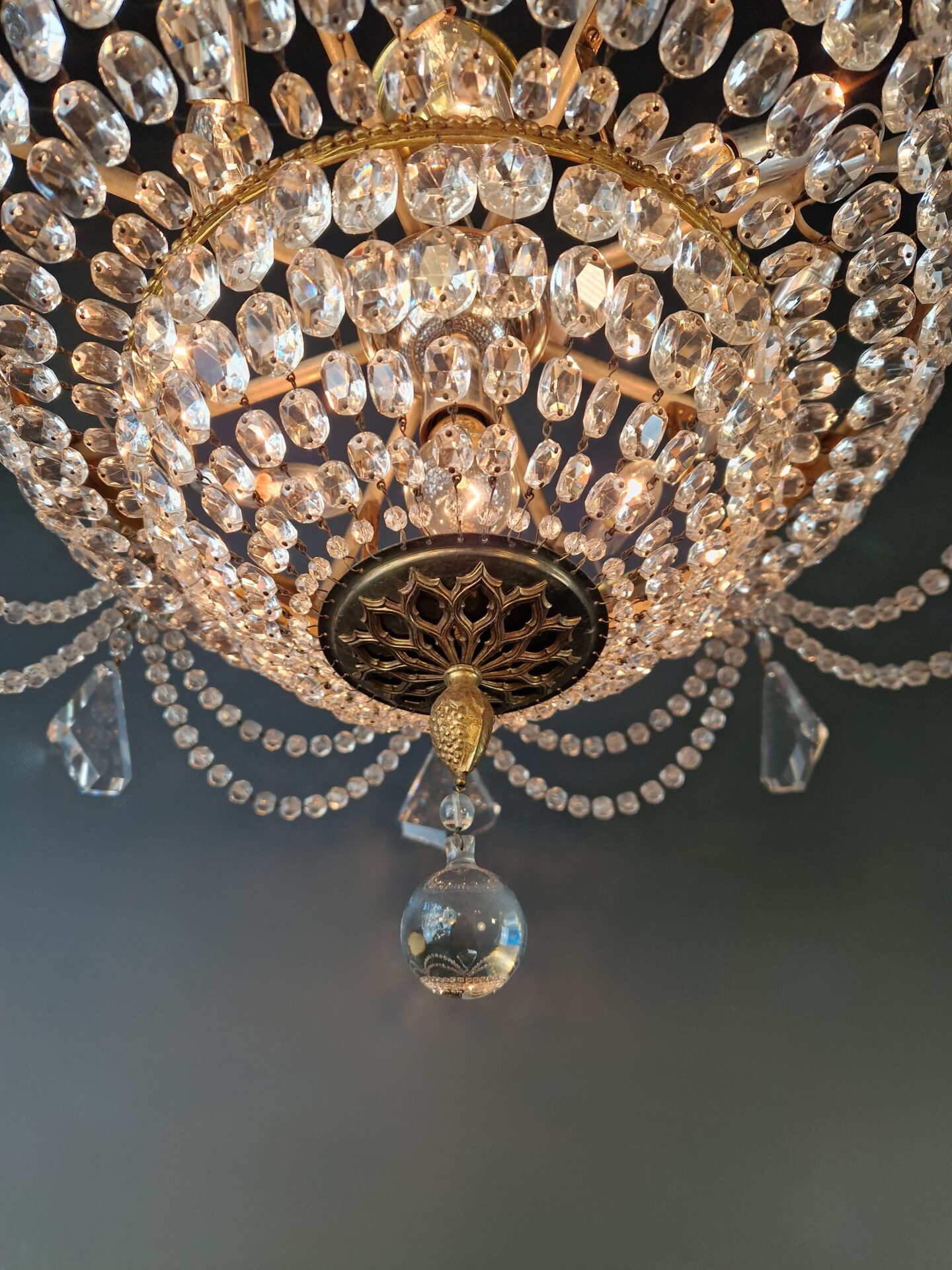 Das Messinggestell verleiht dem Lüster einen warmen, goldenen Ton und unterstreicht seinen dekorativen und luxuriösen Charakter.
