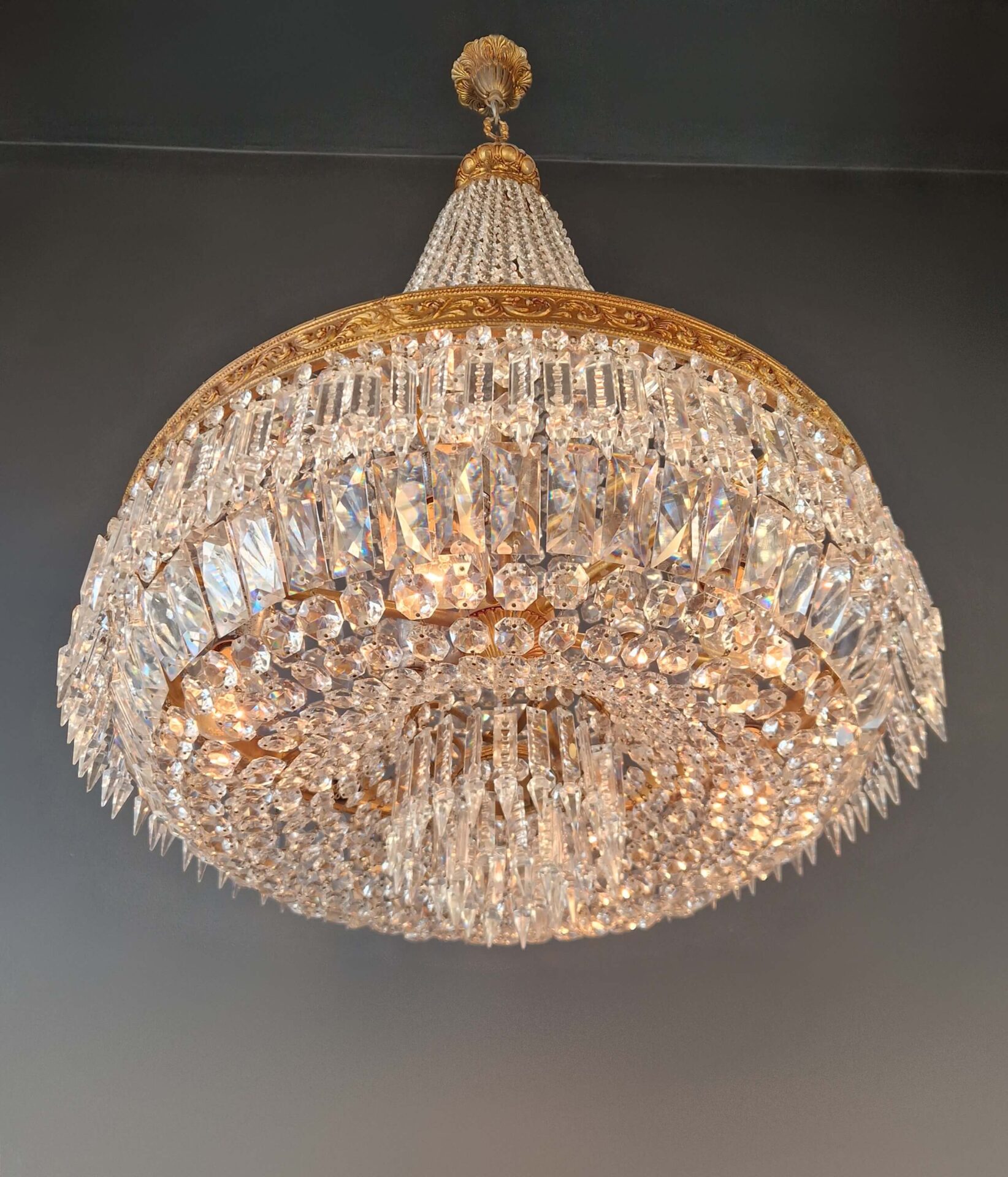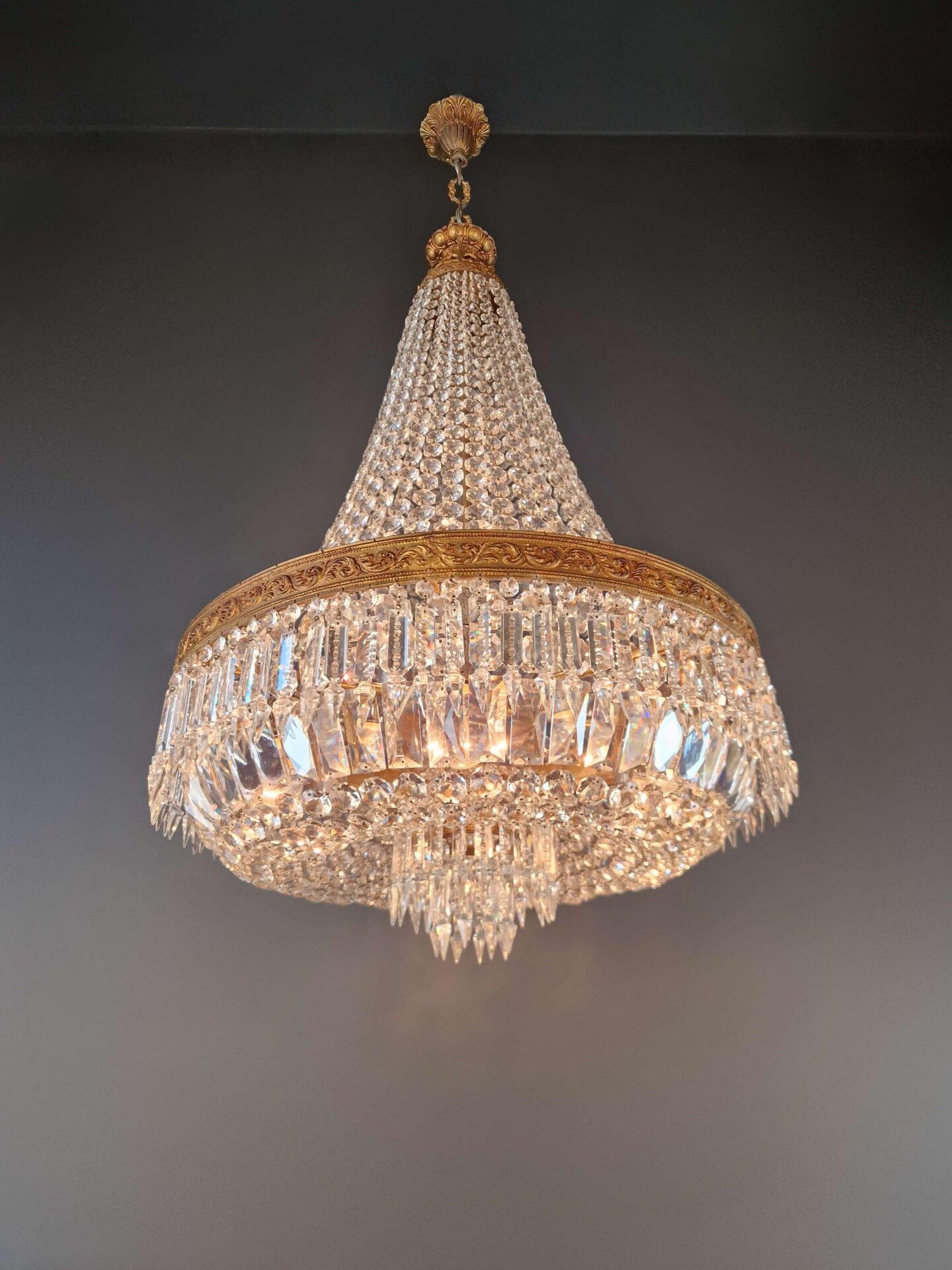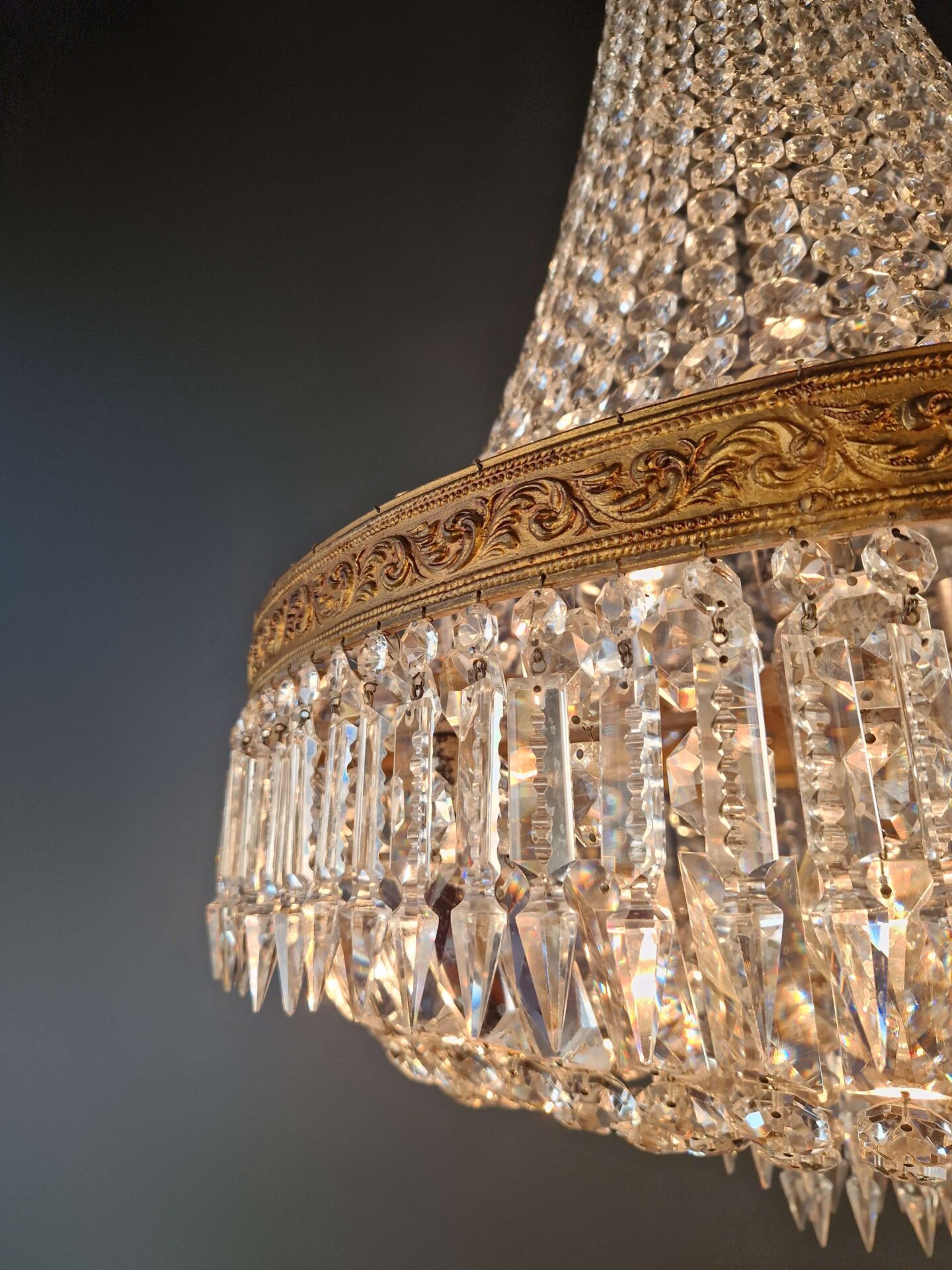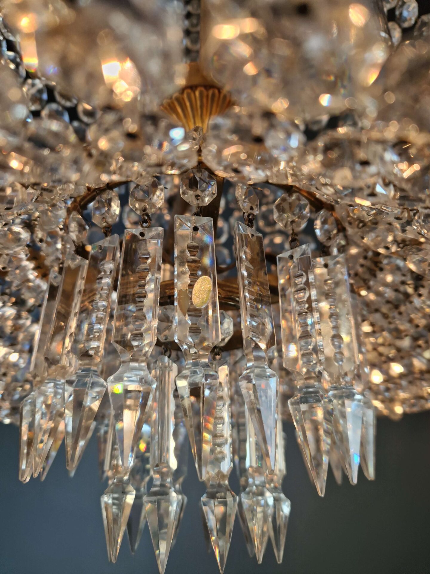 Vor dem Versand wird der Kronleuchter gründlich gereinigt und fehlende Kristalle werden sorgfältig ersetzt, um sicherzustellen, dass er in makellosem Zustand bei Ihnen ankommt.