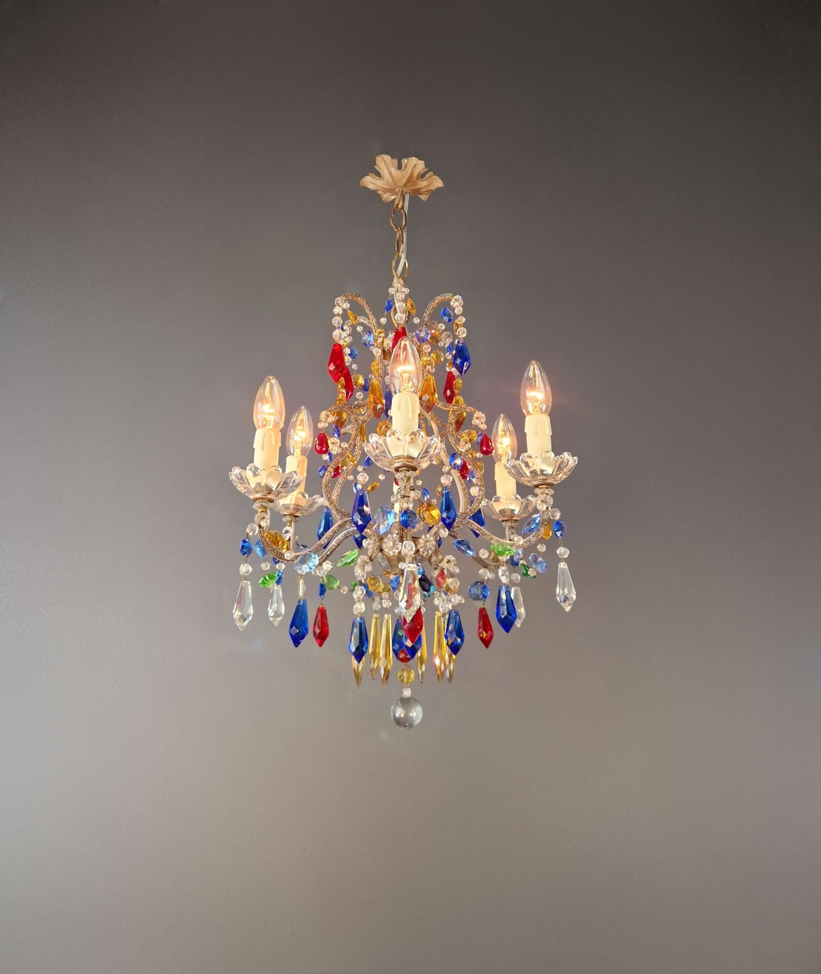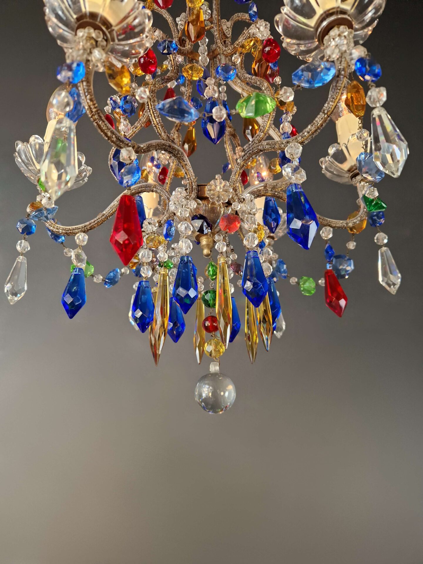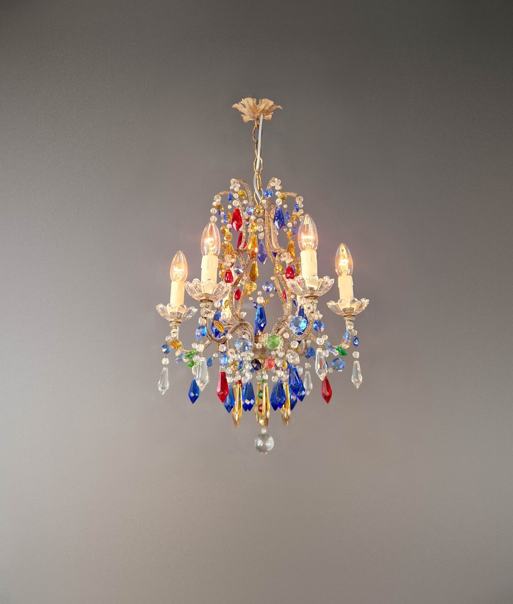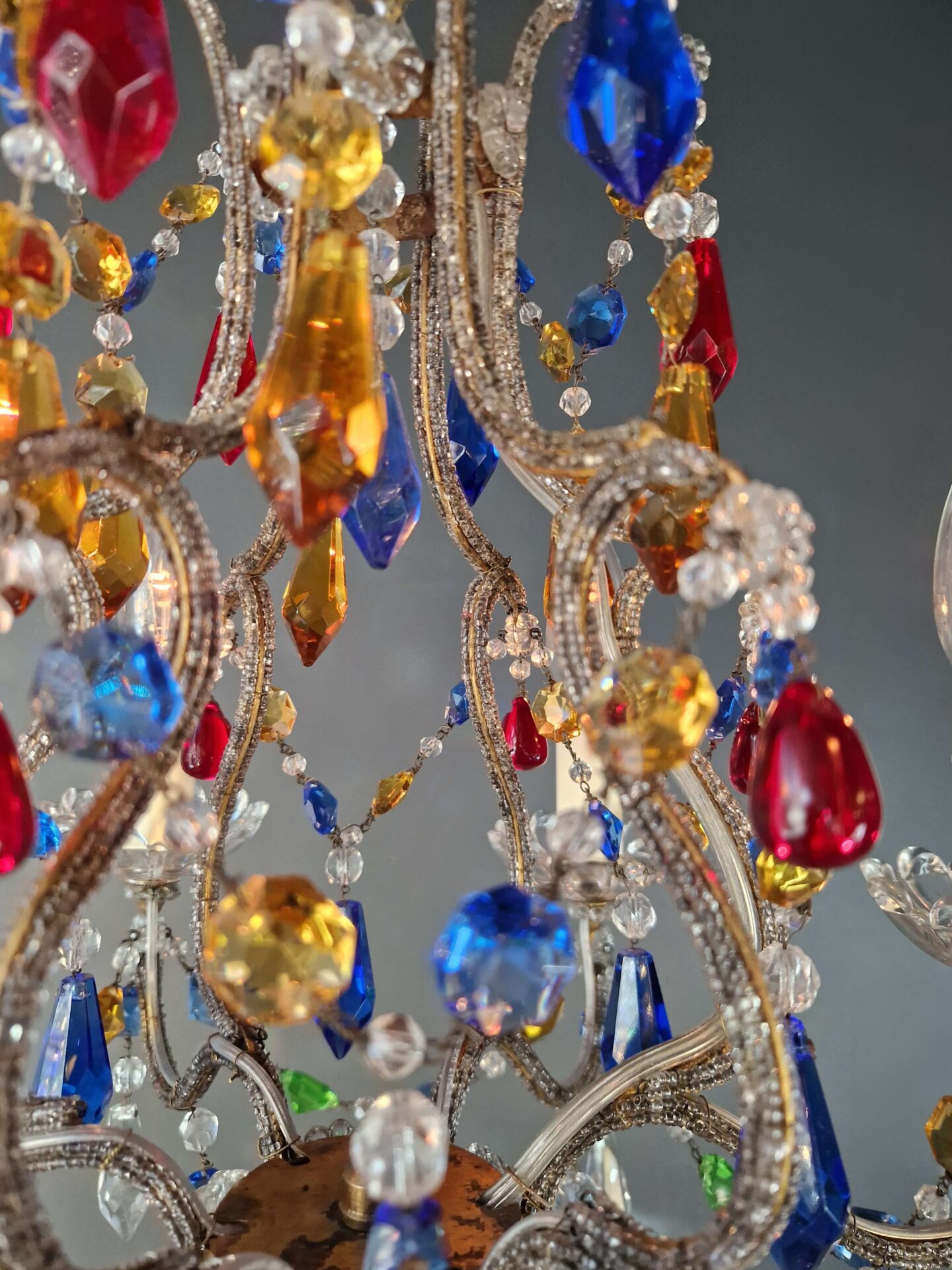 Der anmutig geschwungene Rahmen ist reich verziert mit handgeschliffenen farbigen Kristalltropfen in leuchtenden Blau-, Rot-, Grün-, Gelb- und Klartönen. Diese unverwechselbare Farbgebung und das elegante, luftige Design sind typisch für die Florentiner Handwerkskunst und verbinden klassische Eleganz mit einem Hauch verspielter italienischer Kunstfertigkeit.