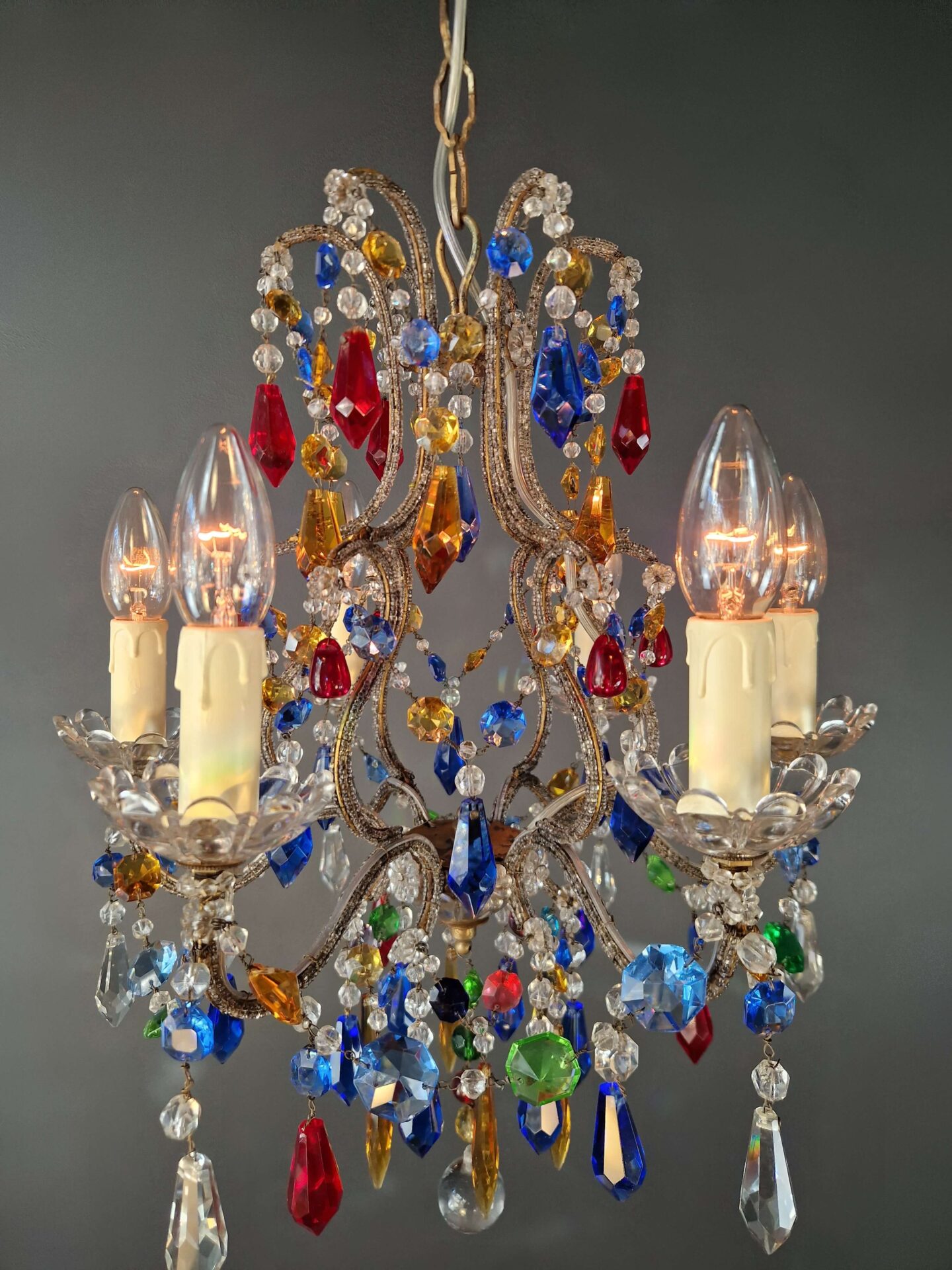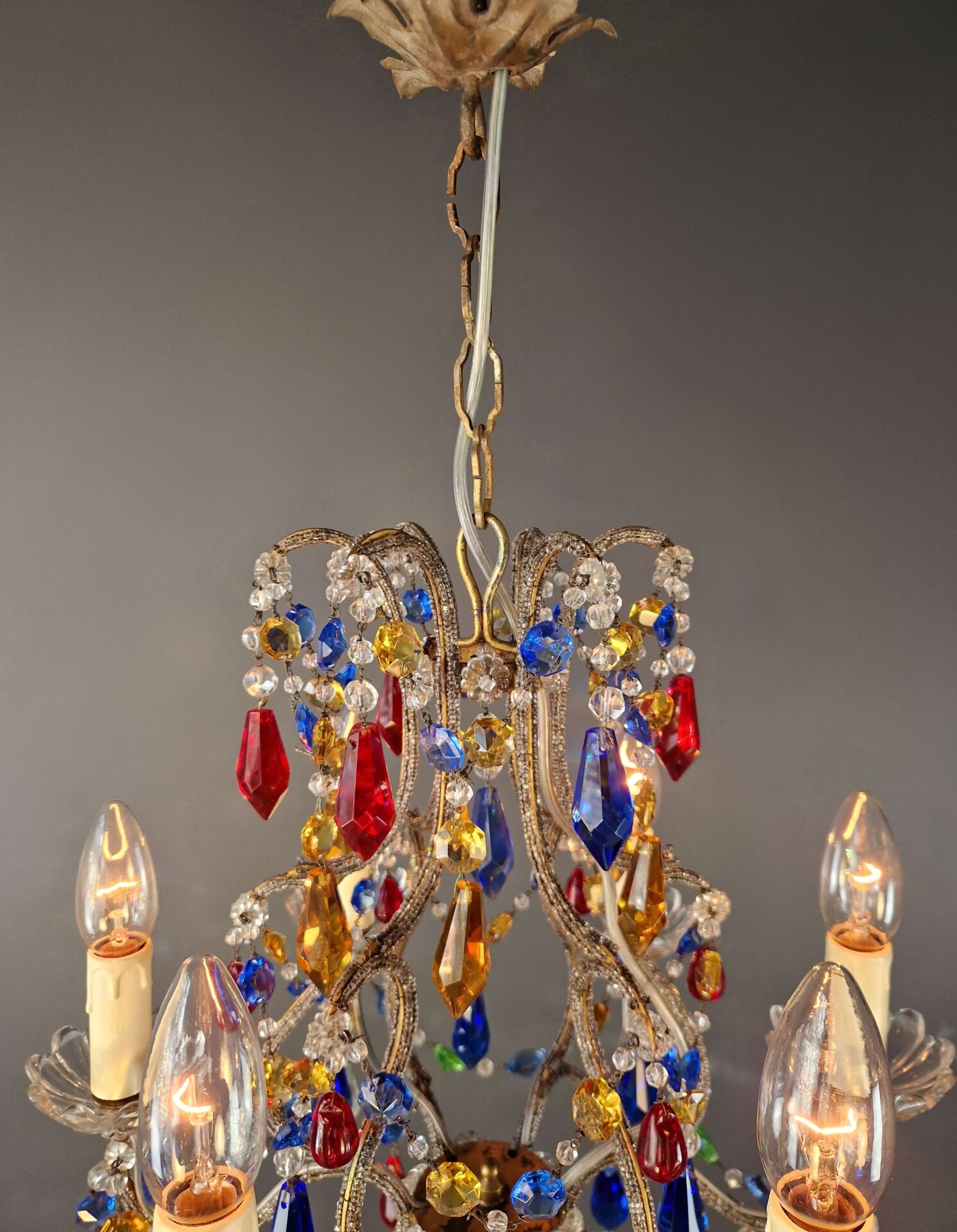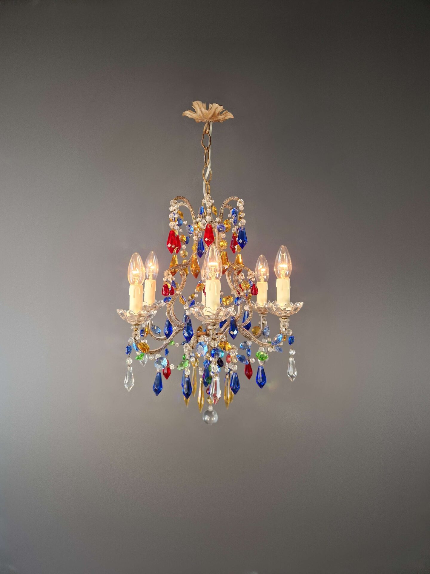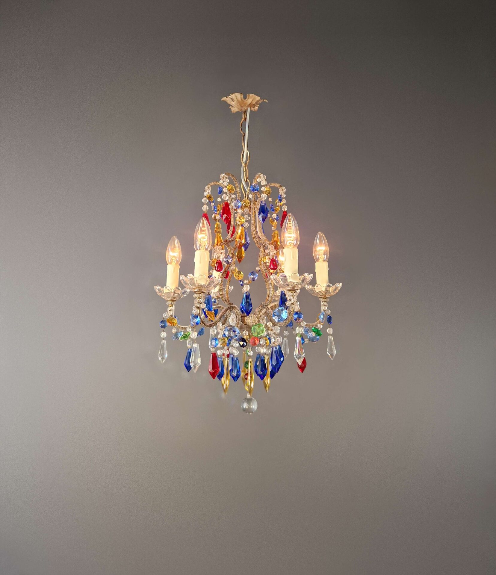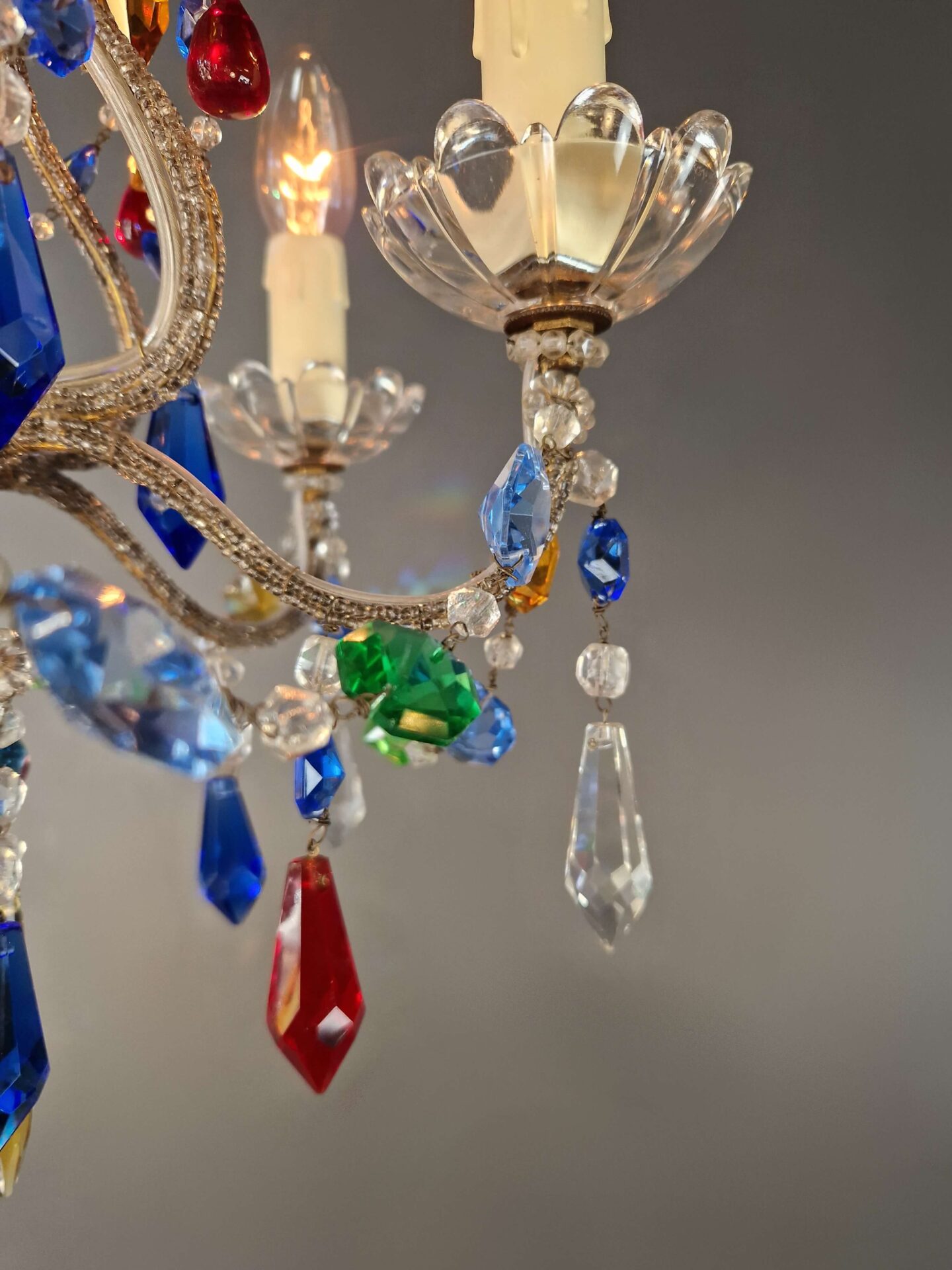 Der anmutig geschwungene Rahmen ist reich verziert mit handgeschliffenen farbigen Kristalltropfen in leuchtenden Blau-, Rot-, Grün-, Gelb- und Klartönen. Diese unverwechselbare Farbgebung und das elegante, luftige Design sind typisch für die Florentiner Handwerkskunst und verbinden klassische Eleganz mit einem Hauch verspielter italienischer Kunstfertigkeit.