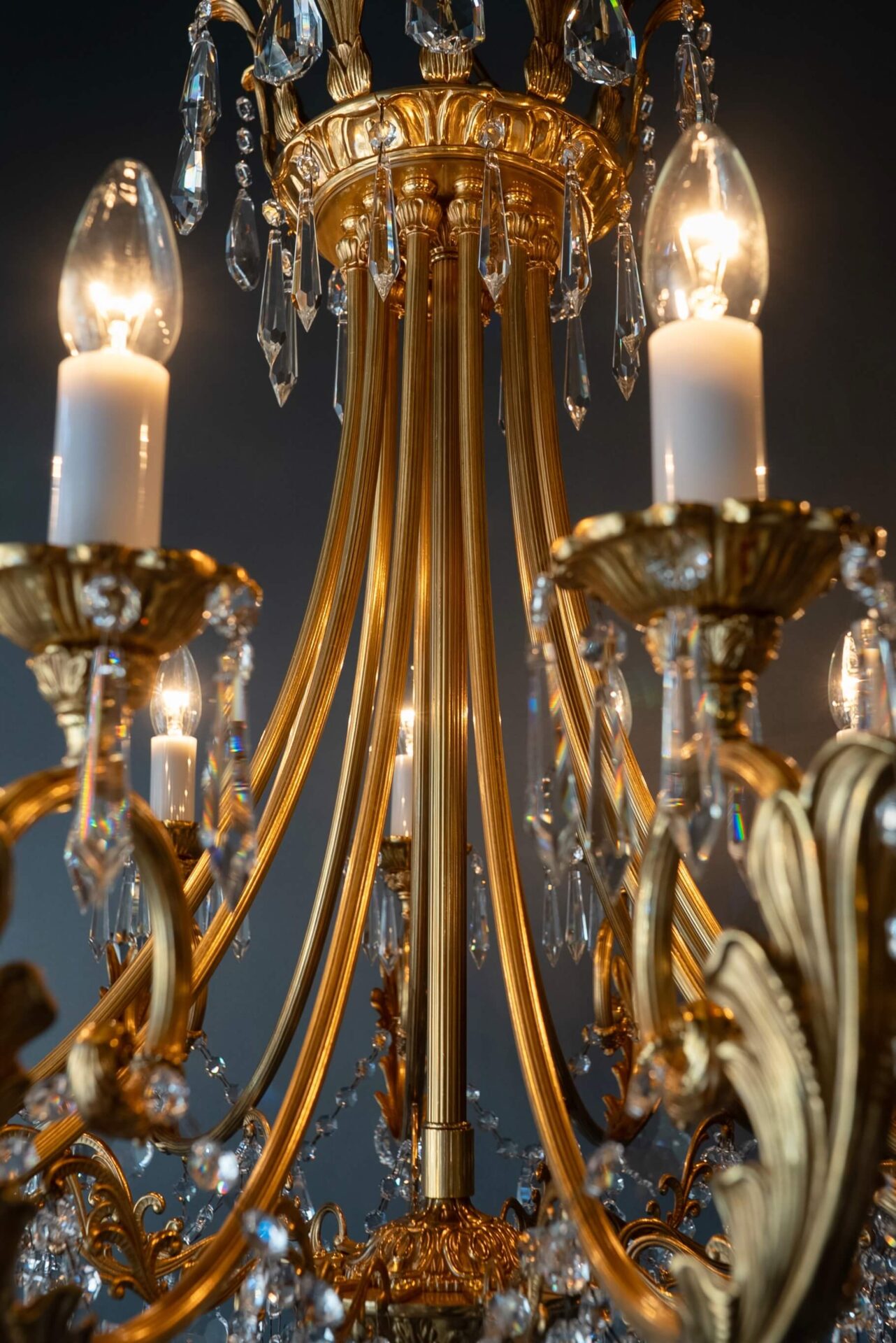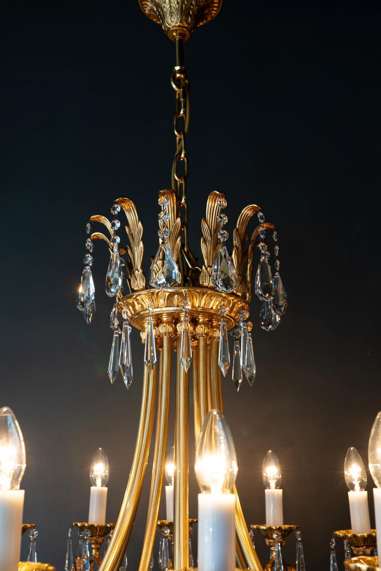 Der aus massivem Messing gefertigte, vergoldete Rahmen strahlt Wärme und Eleganz aus. Die fein geschwungenen Arme, verziert mit kunstvollen Blattmotiven, tragen zwölf E14-Fassungen im Stil klassischer Kerzen, eine raffinierte Anspielung auf traditionelle Beleuchtung.